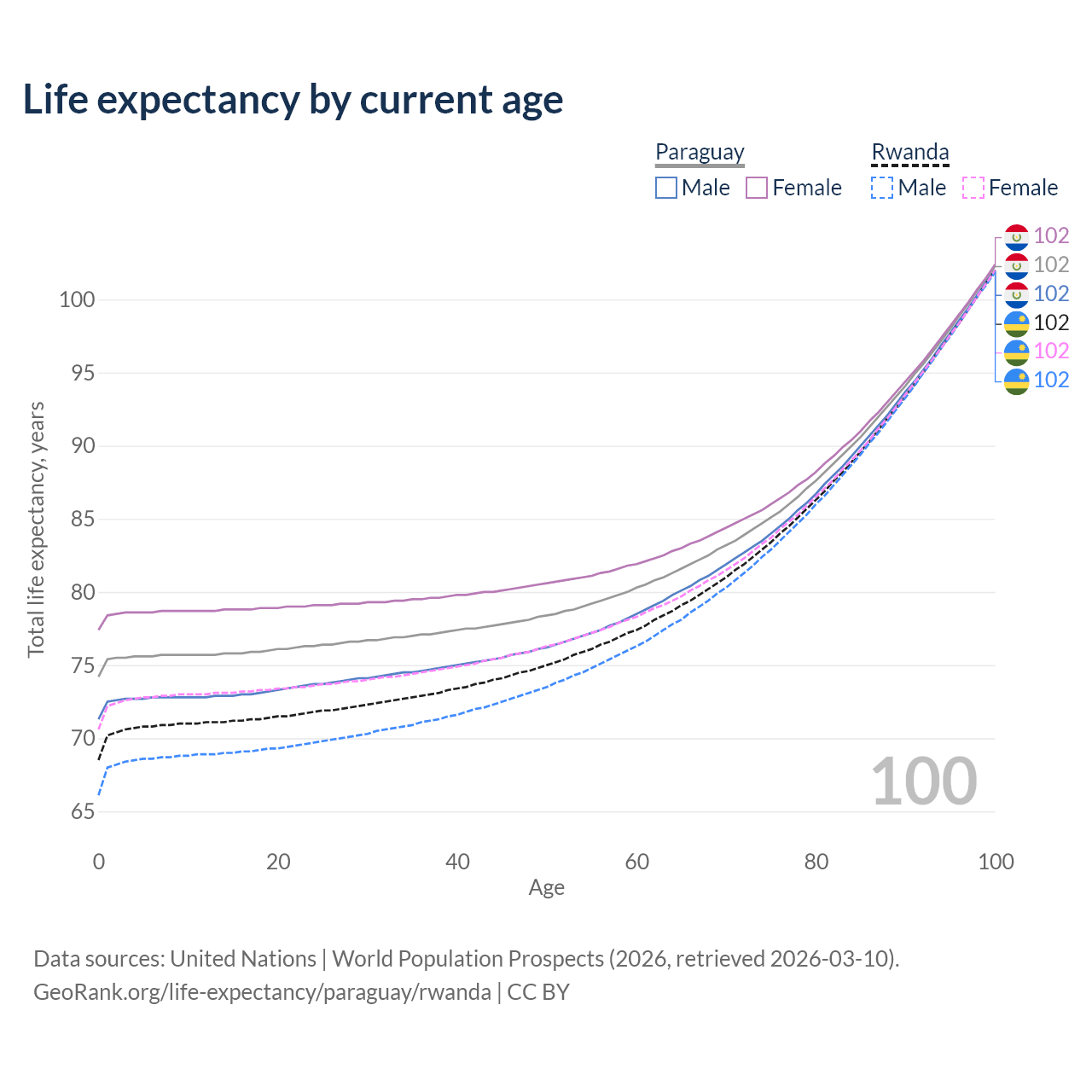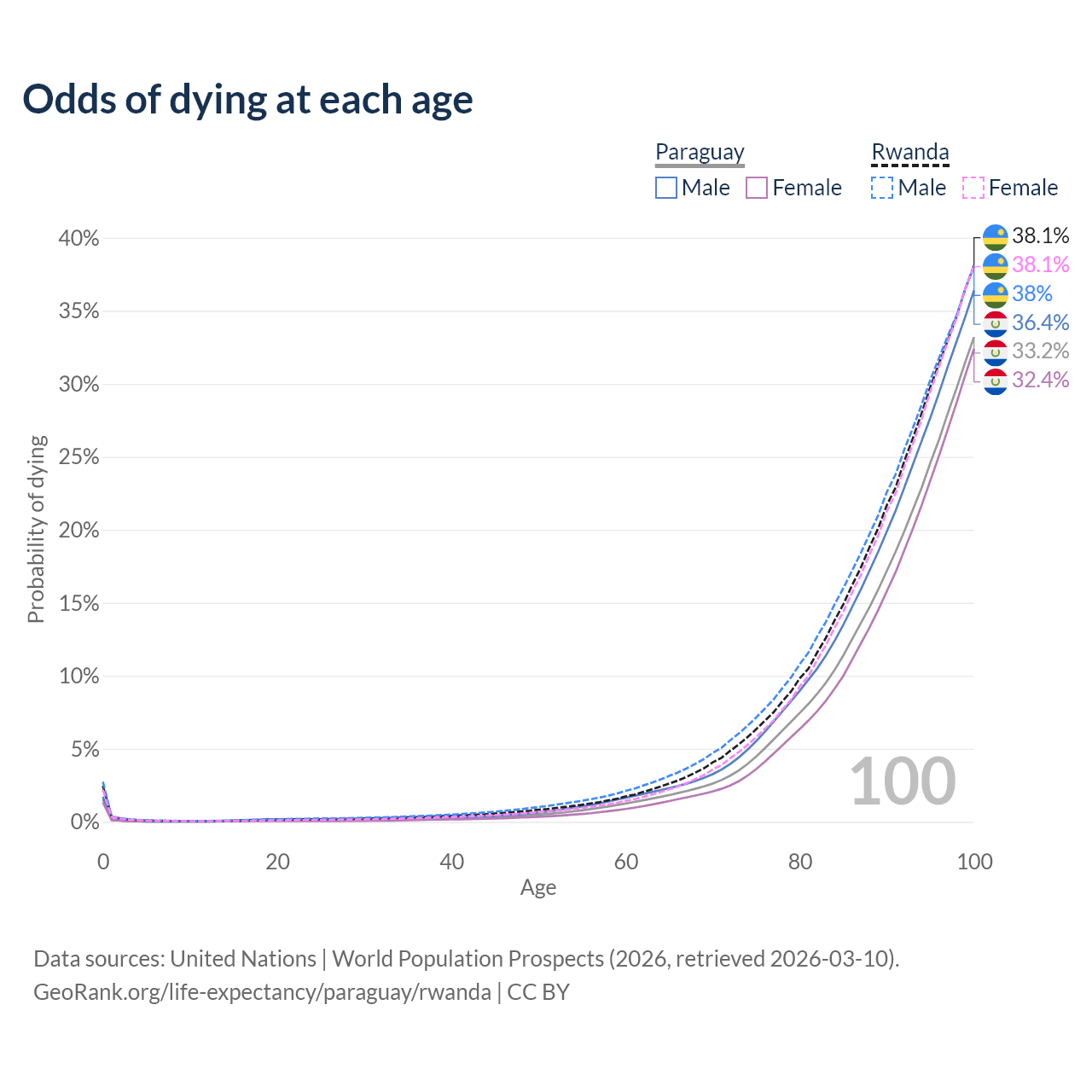 This life expectancy calculator shows the odds of living to 100, 95, 90, and below based on current age for both males and females in Paraguay and Rwanda, along with mean and median age of death. The calculations are based on the 2026 life tables (actuarial tables) from the UN World Population Prospects.