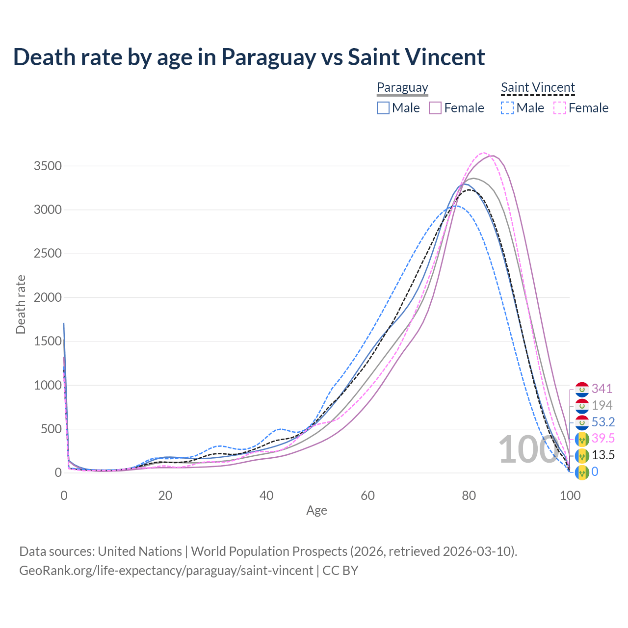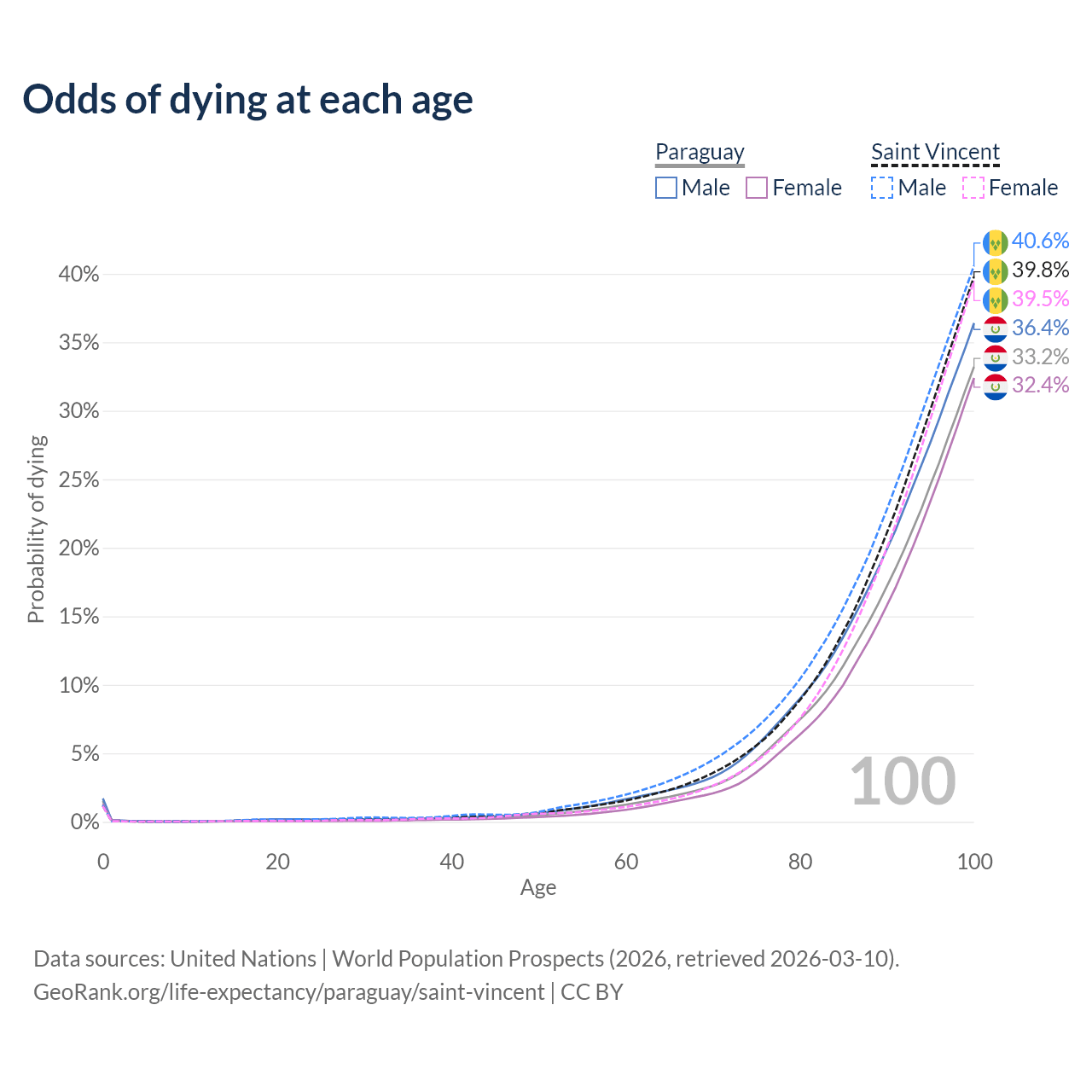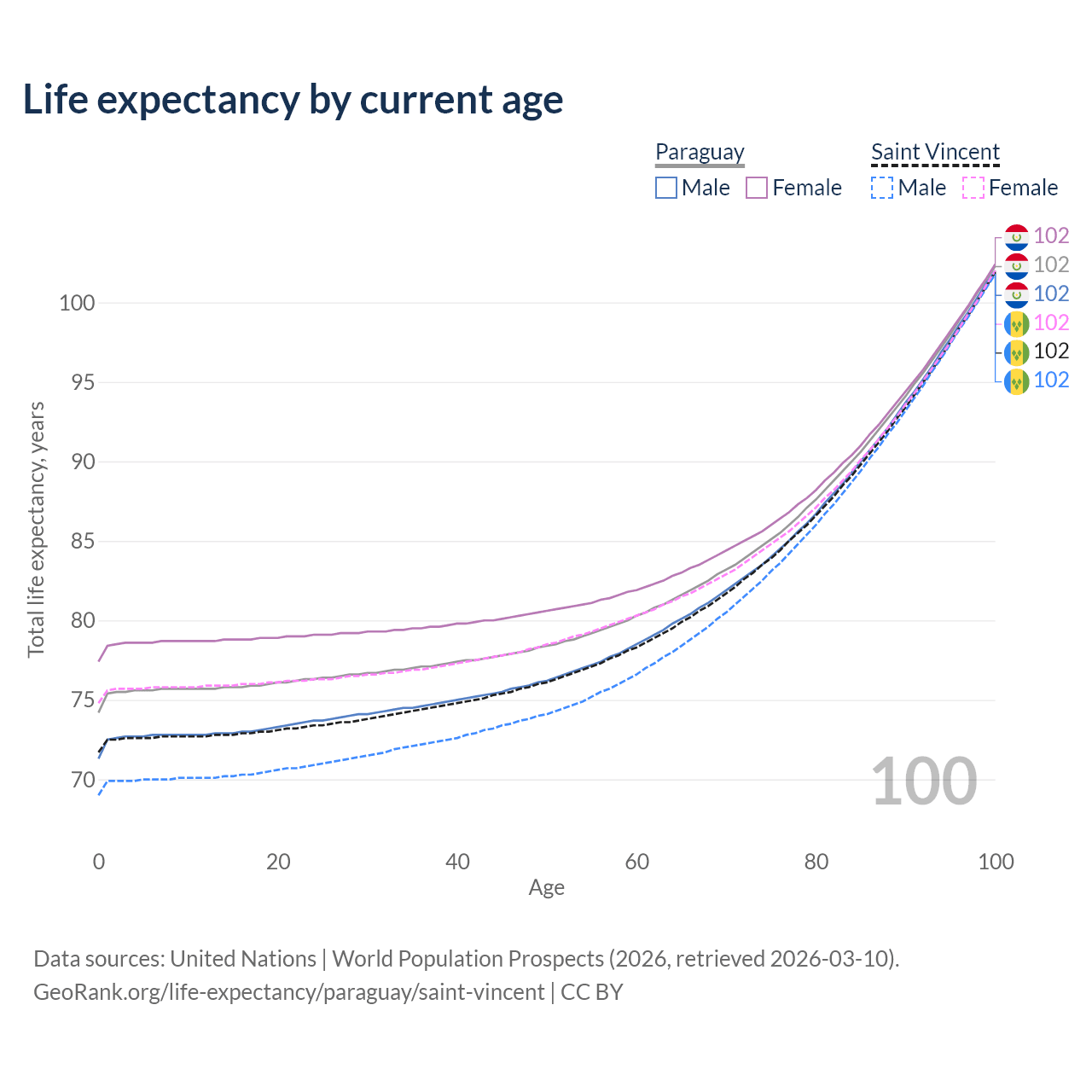 This life expectancy calculator shows the odds of living to 100, 95, 90, and below based on current age for both males and females in Paraguay and Saint Vincent, along with mean and median age of death. The calculations are based on the 2026 life tables (actuarial tables) from the UN World Population Prospects.