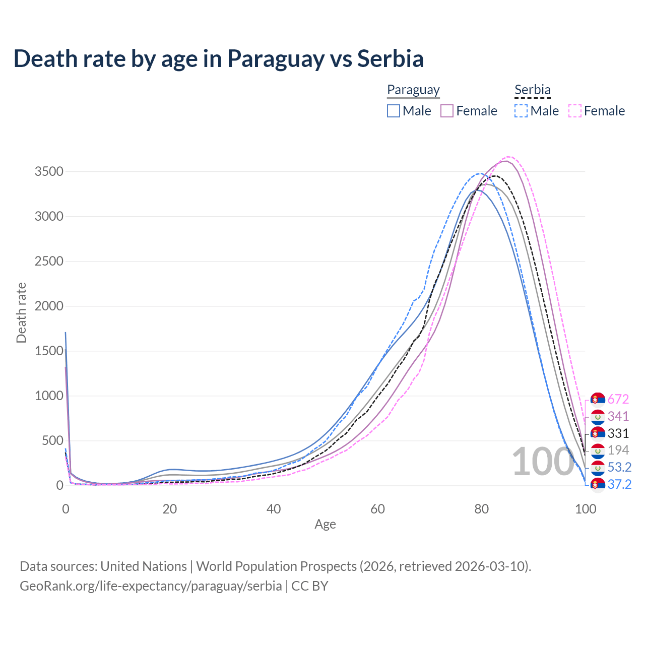 This life expectancy calculator shows the odds of living to 100, 95, 90, and below based on current age for both males and females in Paraguay and Serbia, along with mean and median age of death. The calculations are based on the 2026 life tables (actuarial tables) from the UN World Population Prospects.