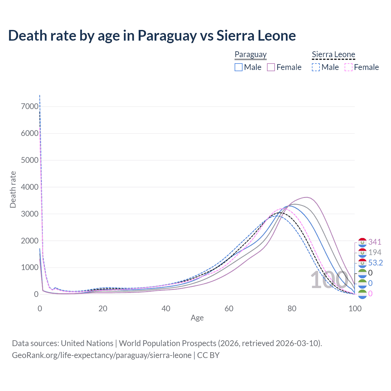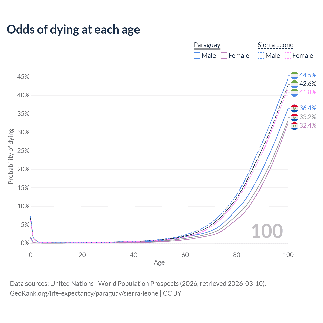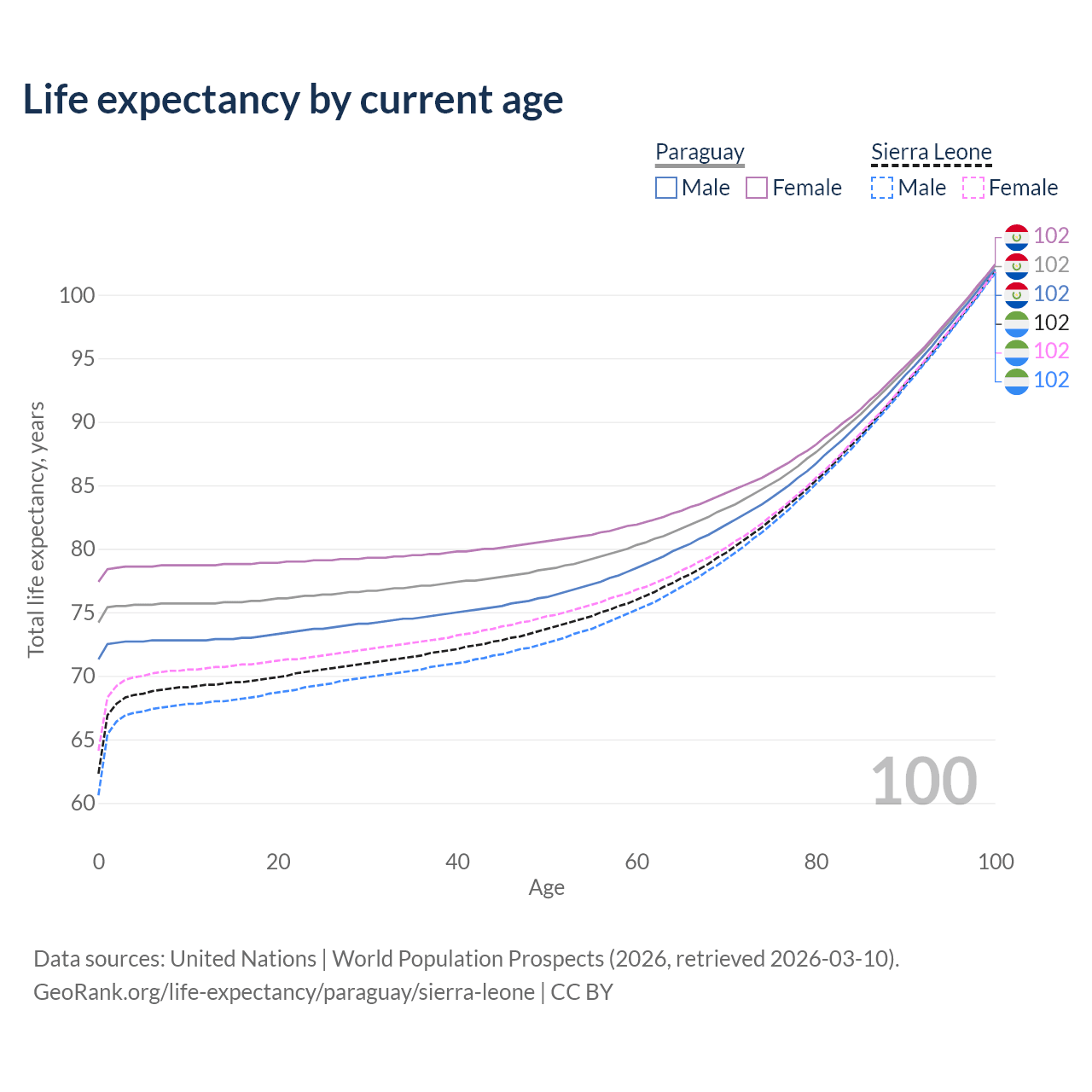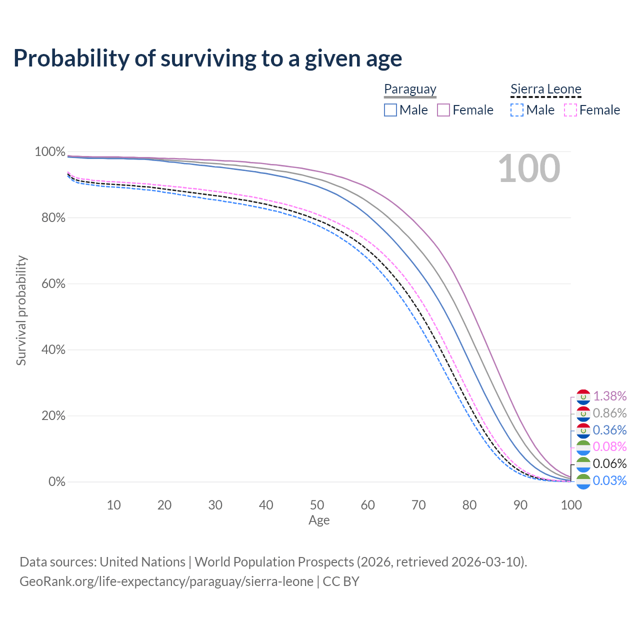 This life expectancy calculator shows the odds of living to 100, 95, 90, and below based on current age for both males and females in Paraguay and Sierra Leone, along with mean and median age of death. The calculations are based on the 2026 life tables (actuarial tables) from the UN World Population Prospects.