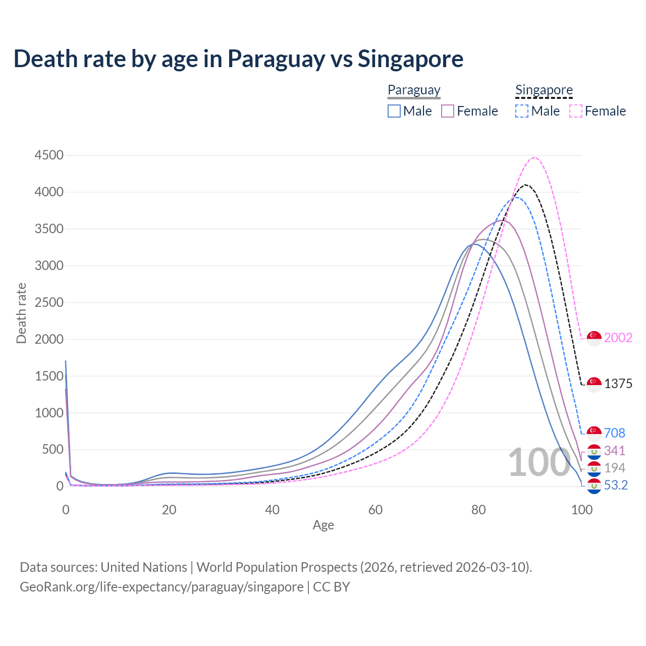 This life expectancy calculator shows the odds of living to 100, 95, 90, and below based on current age for both males and females in Paraguay and Singapore, along with mean and median age of death. The calculations are based on the 2026 life tables (actuarial tables) from the UN World Population Prospects.
