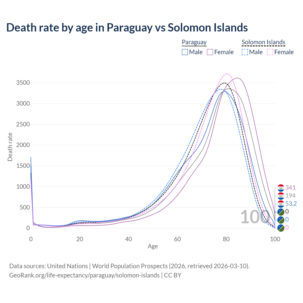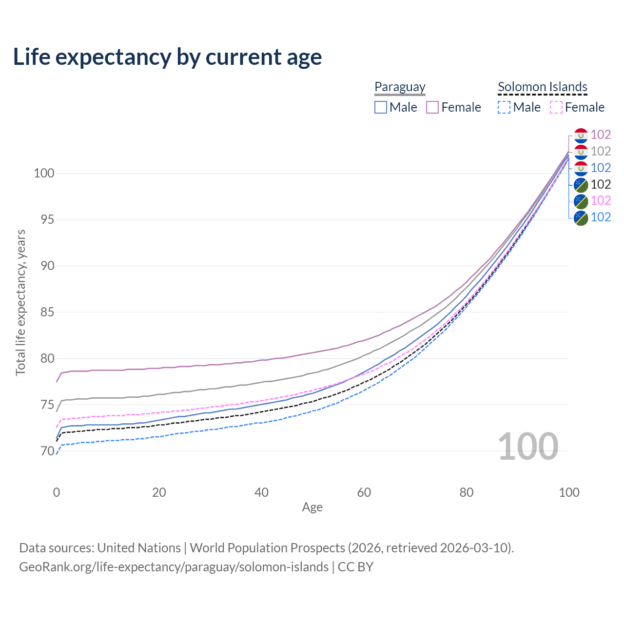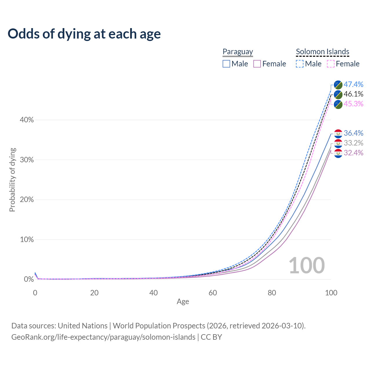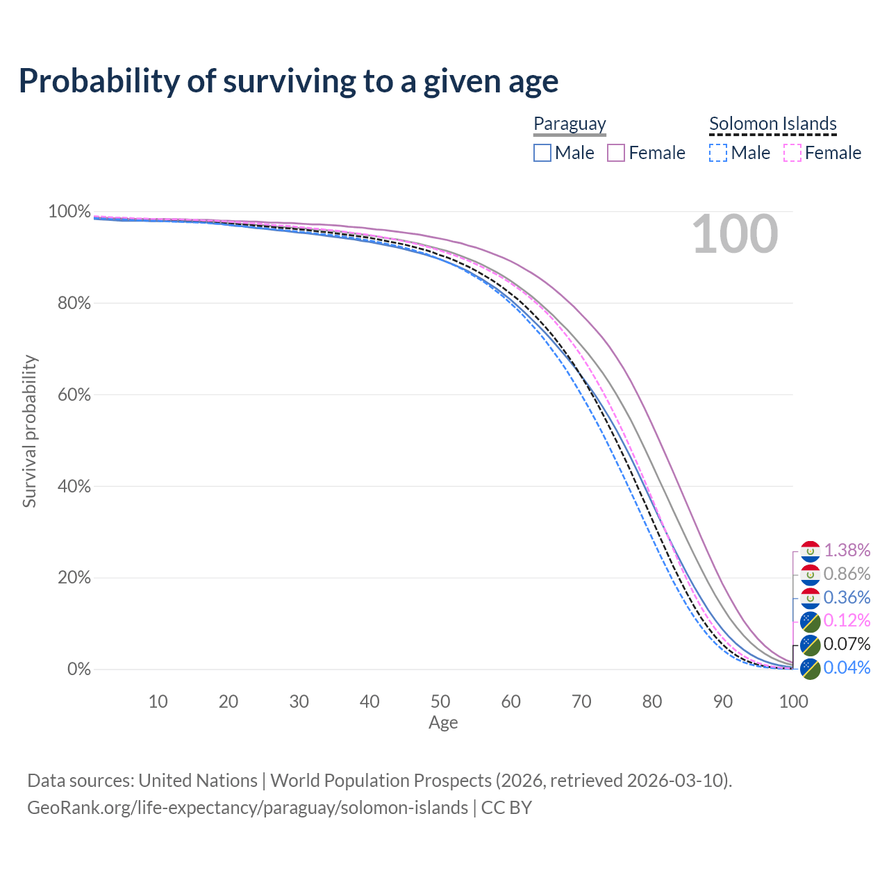 This life expectancy calculator shows the odds of living to 100, 95, 90, and below based on current age for both males and females in Paraguay and the Solomon Islands, along with mean and median age of death. The calculations are based on the 2026 life tables (actuarial tables) from the UN World Population Prospects.