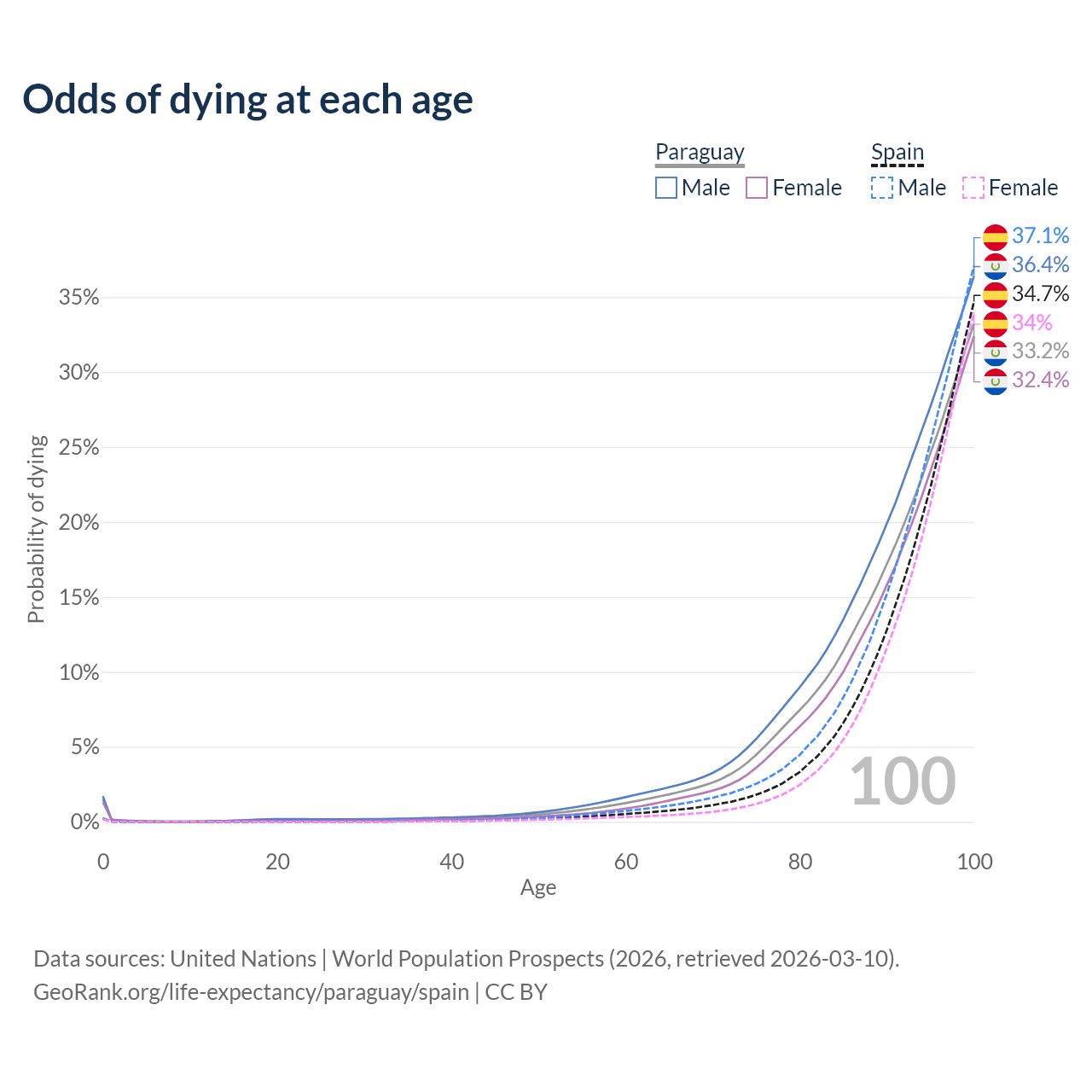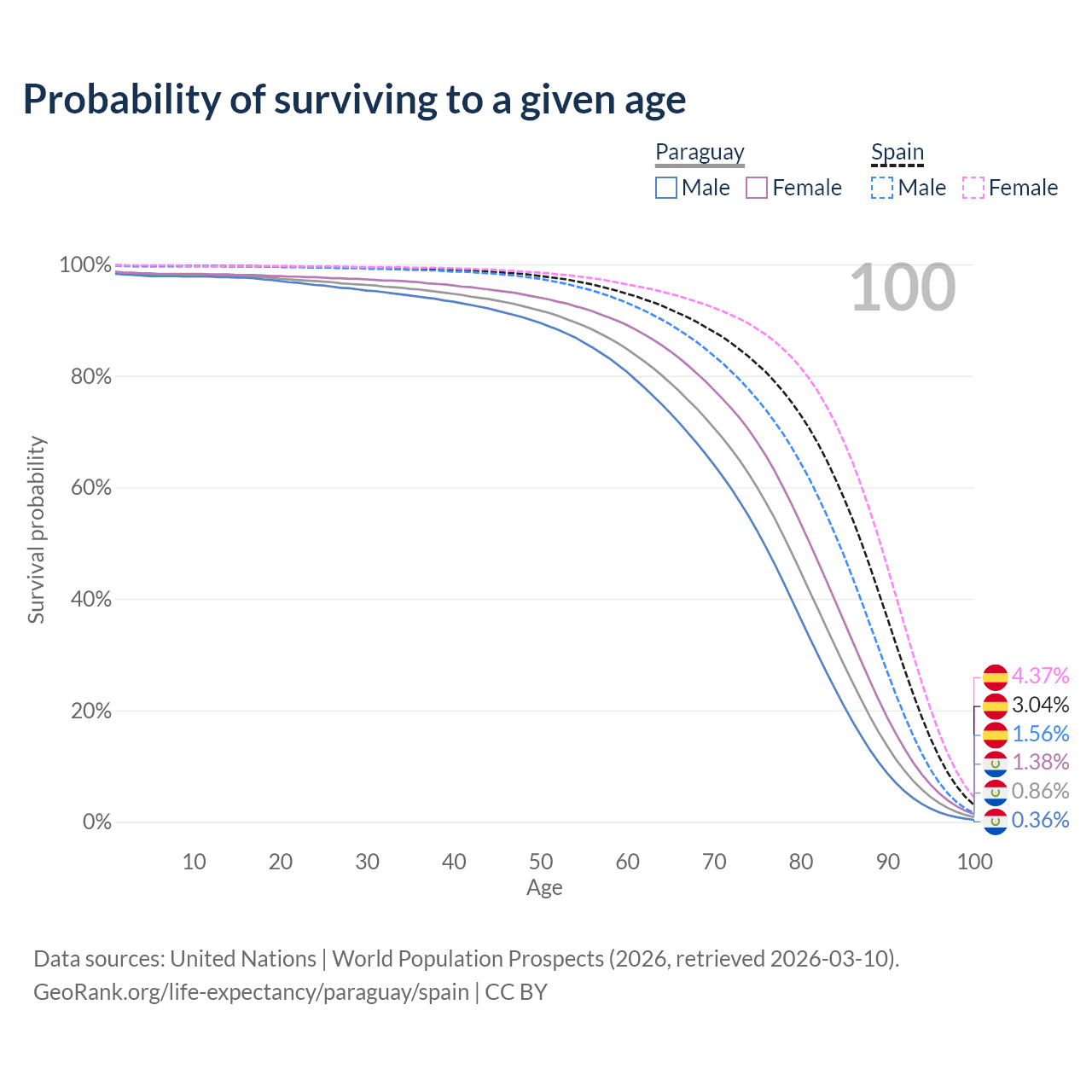 This life expectancy calculator shows the odds of living to 100, 95, 90, and below based on current age for both males and females in Paraguay and Spain, along with mean and median age of death. The calculations are based on the 2026 life tables (actuarial tables) from the UN World Population Prospects.