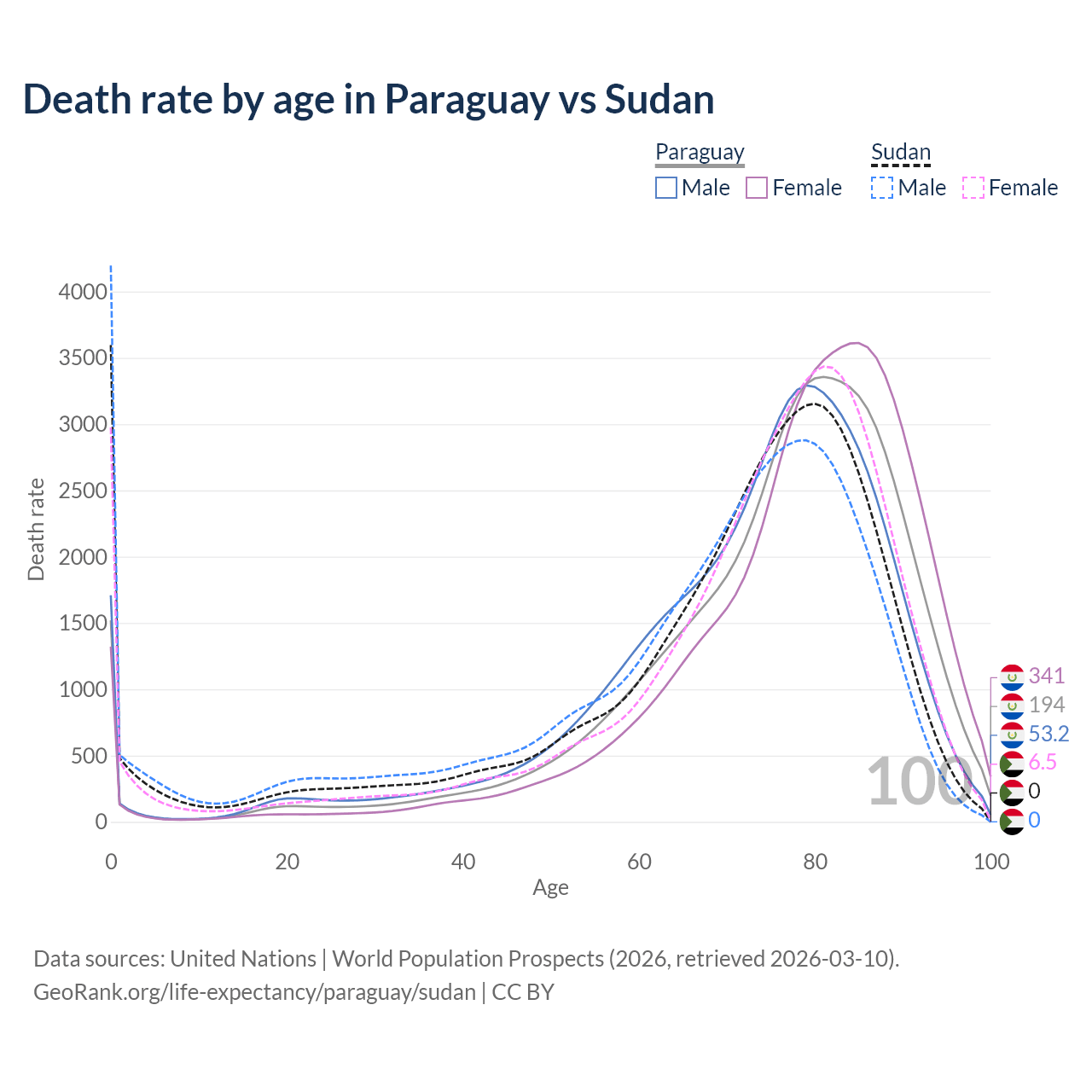 In Paraguay, the most common age of death is 81, compared to 0 in Sudan. The median age of death is 78.4 in Paraguay and 74.1 in Sudan, meaning only half of each cohort is expected to live past that age.