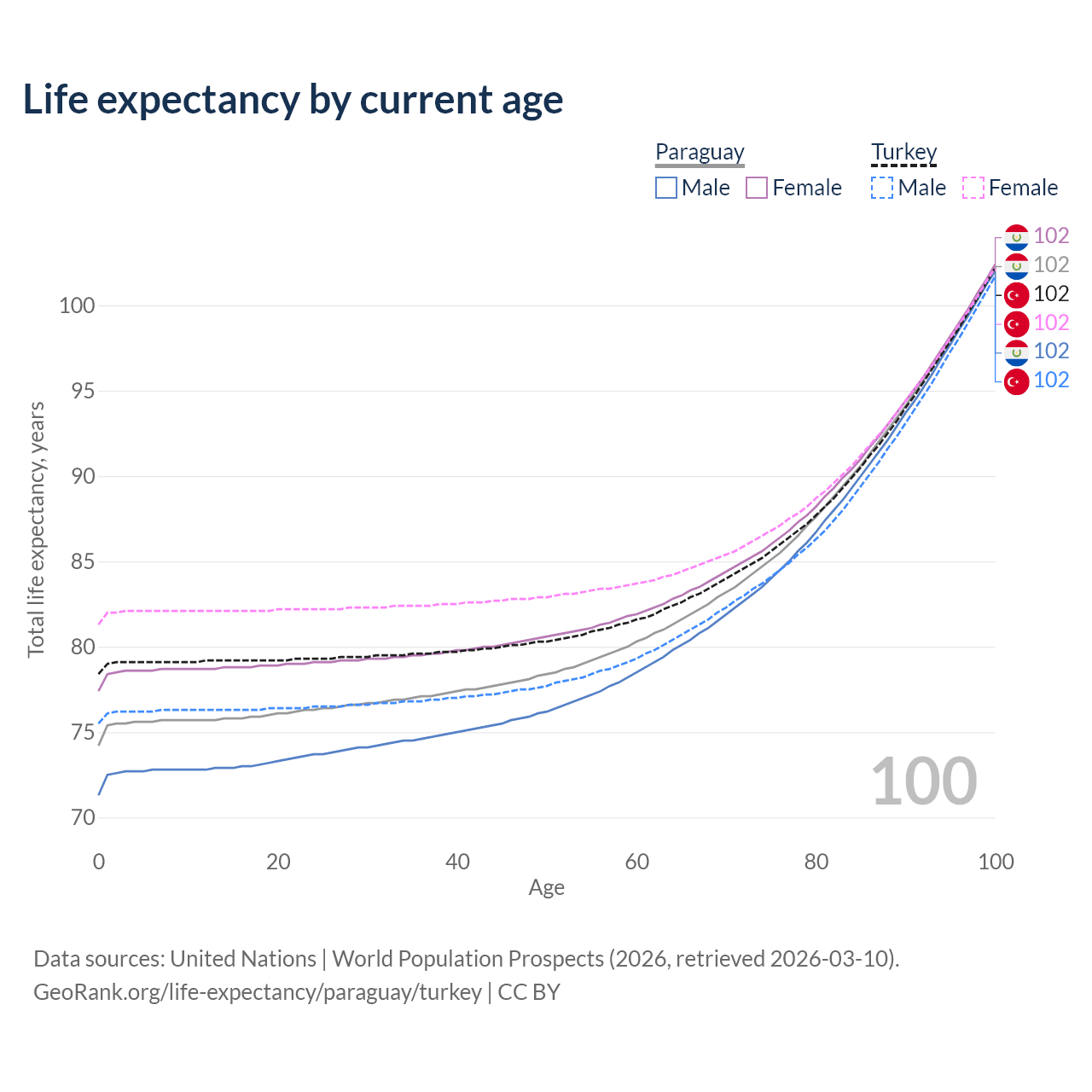 This life expectancy calculator shows the odds of living to 100, 95, 90, and below based on current age for both males and females in Paraguay and Turkey, along with mean and median age of death. The calculations are based on the 2026 life tables (actuarial tables) from the UN World Population Prospects.