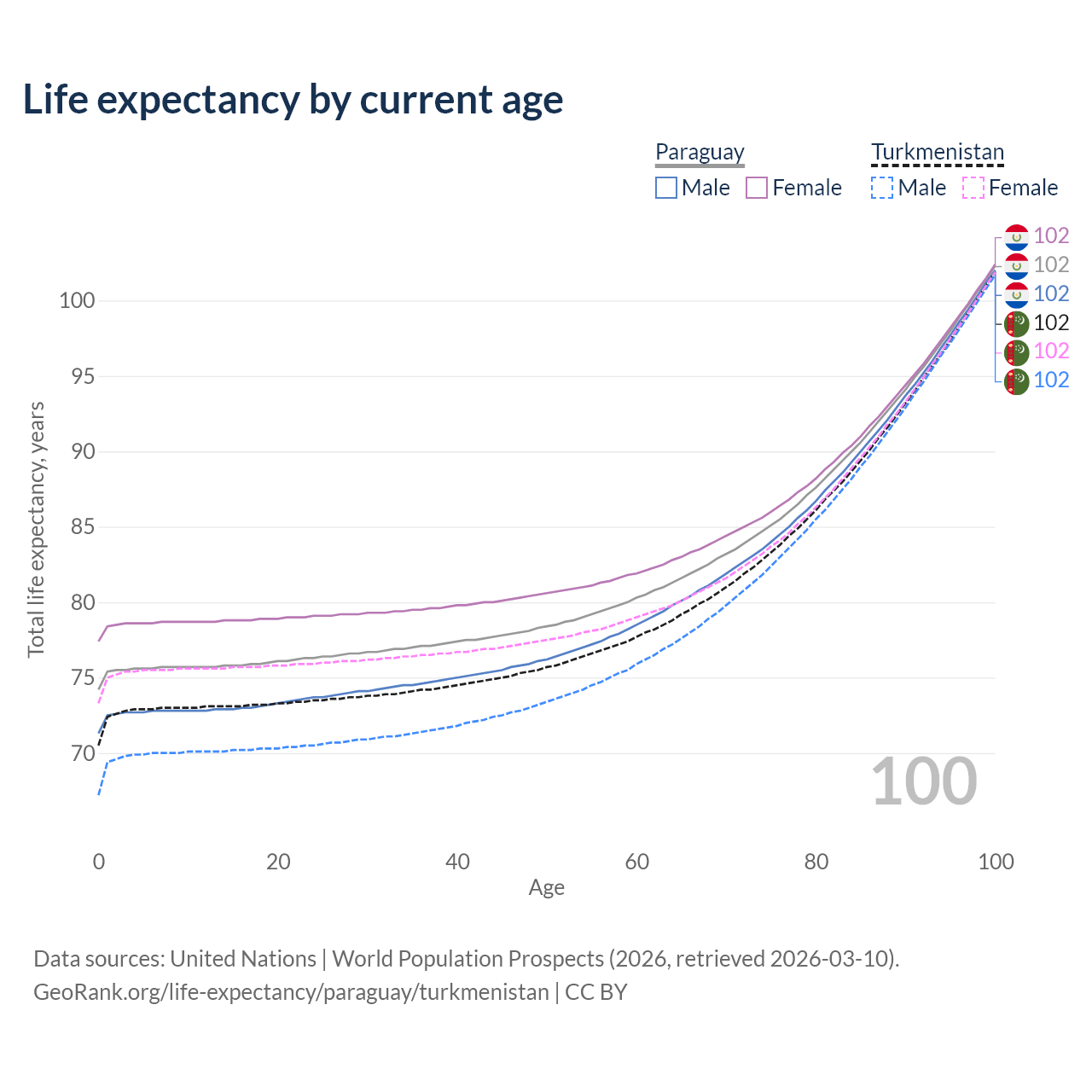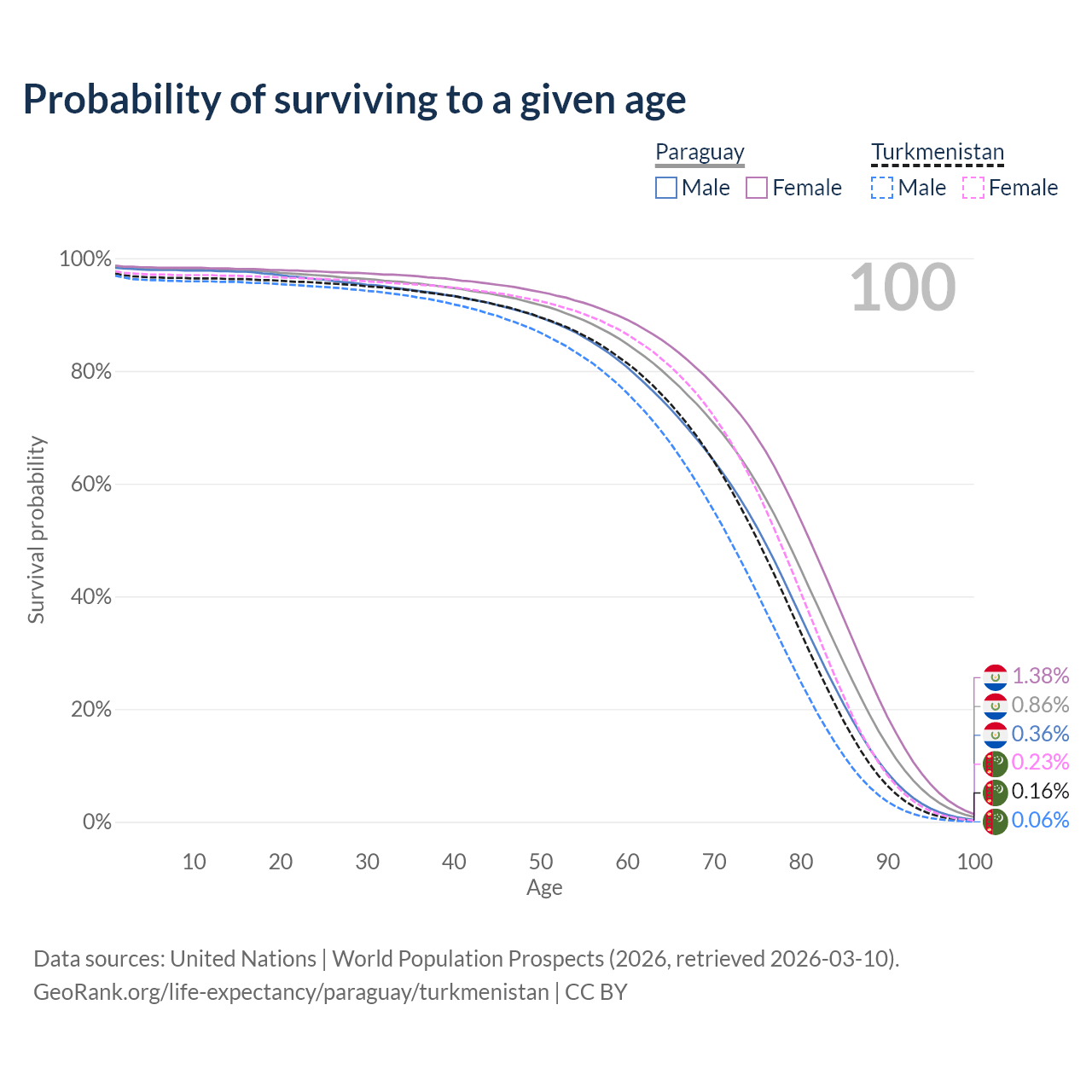 This life expectancy calculator shows the odds of living to 100, 95, 90, and below based on current age for both males and females in Paraguay and Turkmenistan, along with mean and median age of death. The calculations are based on the 2026 life tables (actuarial tables) from the UN World Population Prospects.