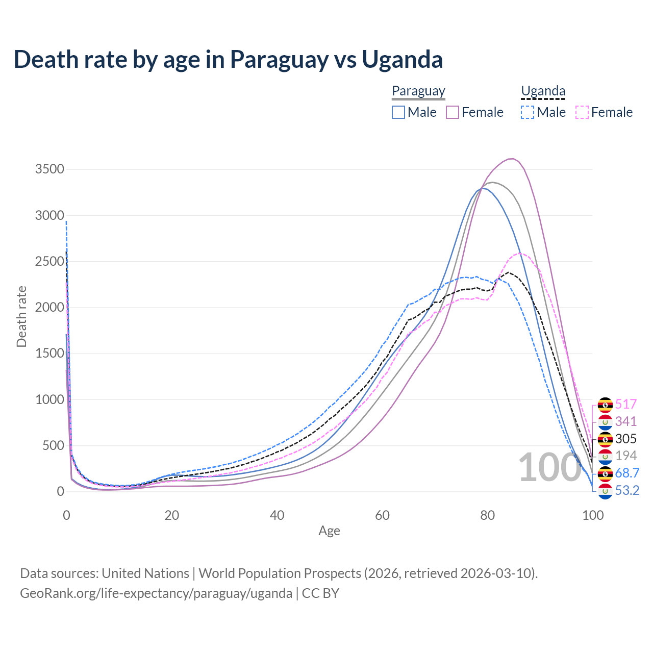 The average life expectancy at birth is 74.2 years in Paraguay vs 68.9 in Uganda. Paraguay is ranked 100/197 by life expectancy, and Uganda is 146/197. In Paraguay, the life expectancy is 71.3 years for males and 77.4 years for females. In Uganda, it's 65.9 years for males and 71.8 years for females.