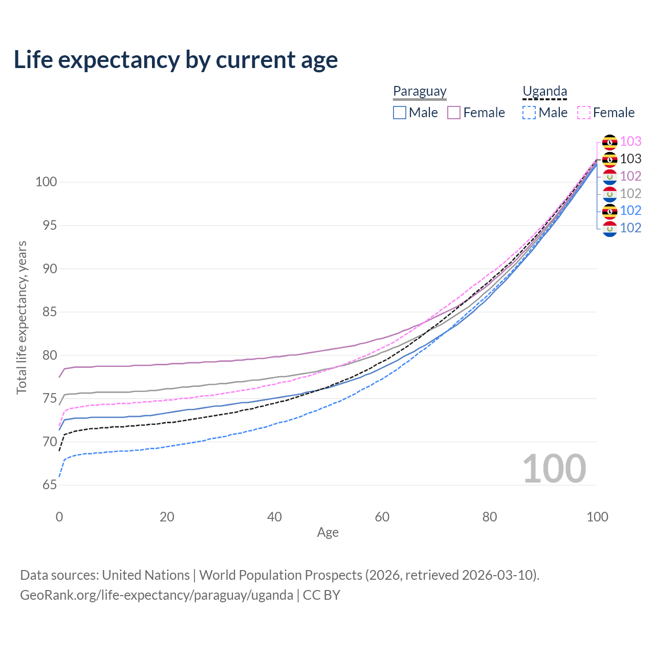 This life expectancy calculator shows the odds of living to 100, 95, 90, and below based on current age for both males and females in Paraguay and Uganda, along with mean and median age of death. The calculations are based on the 2026 life tables (actuarial tables) from the UN World Population Prospects.