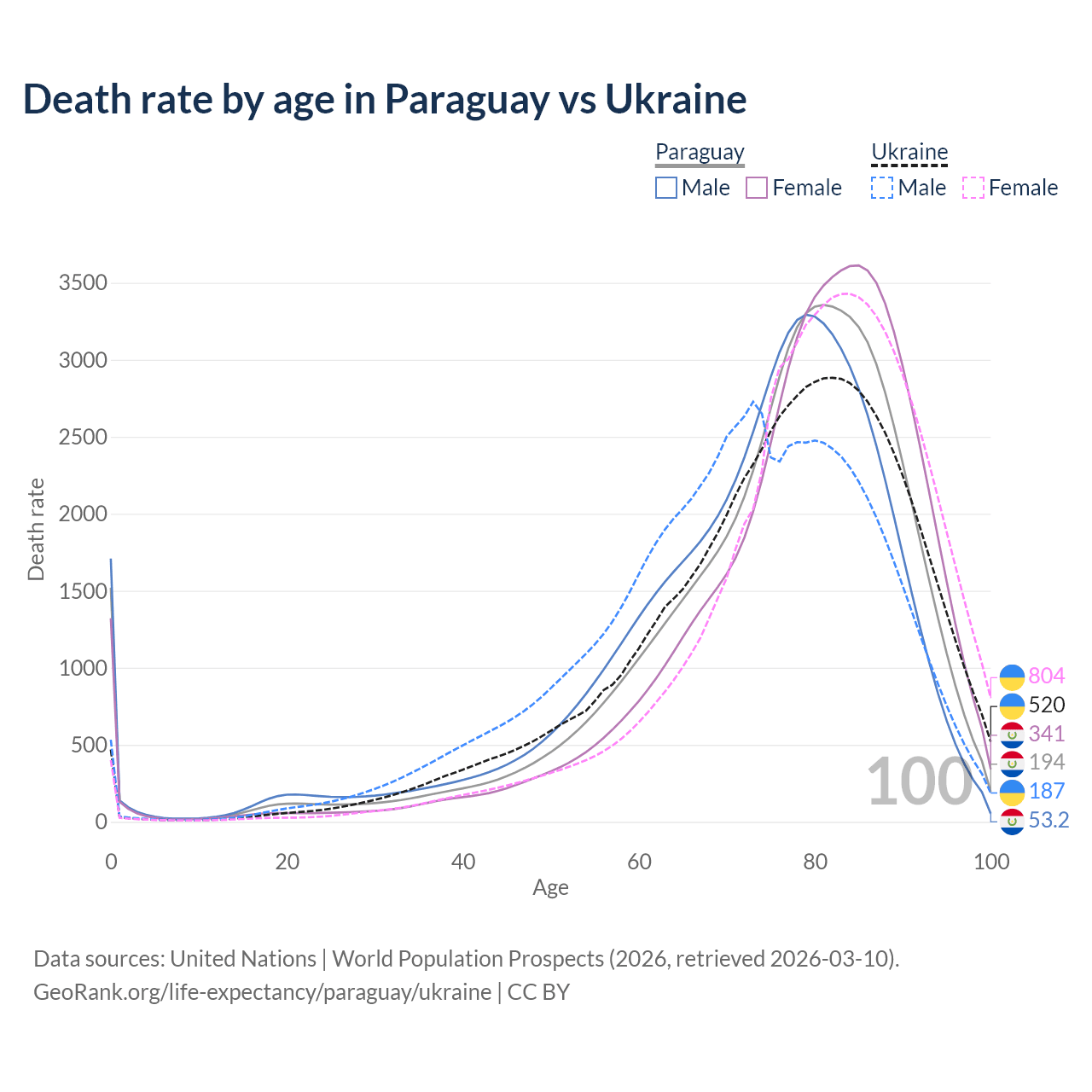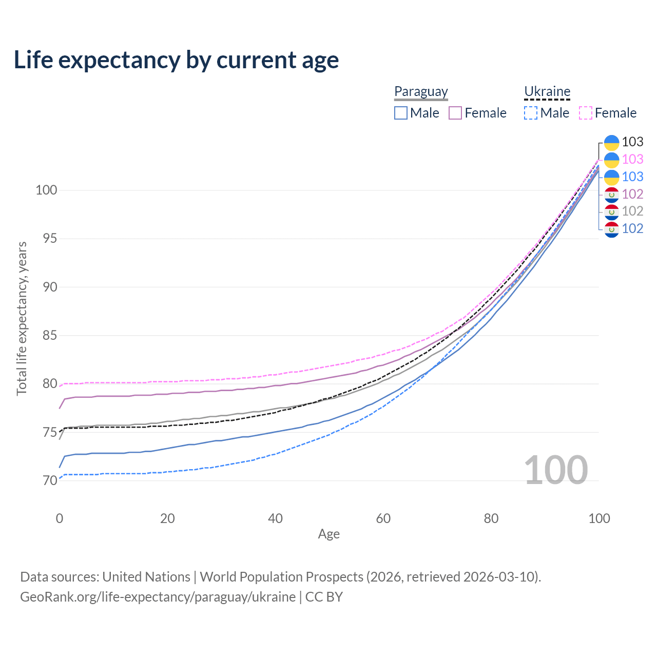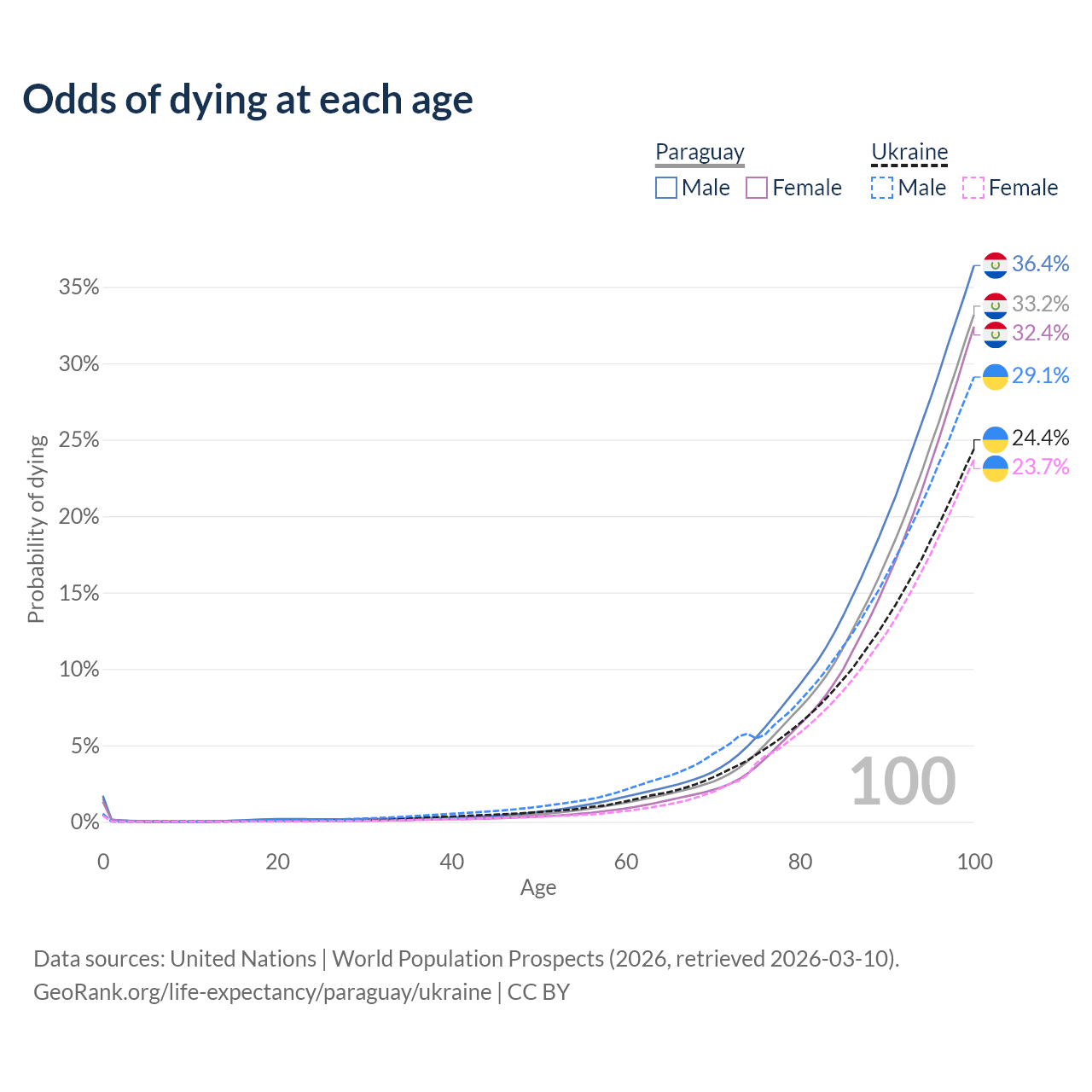 This life expectancy calculator shows the odds of living to 100, 95, 90, and below based on current age for both males and females in Paraguay and Ukraine, along with mean and median age of death. The calculations are based on the 2026 life tables (actuarial tables) from the UN World Population Prospects.