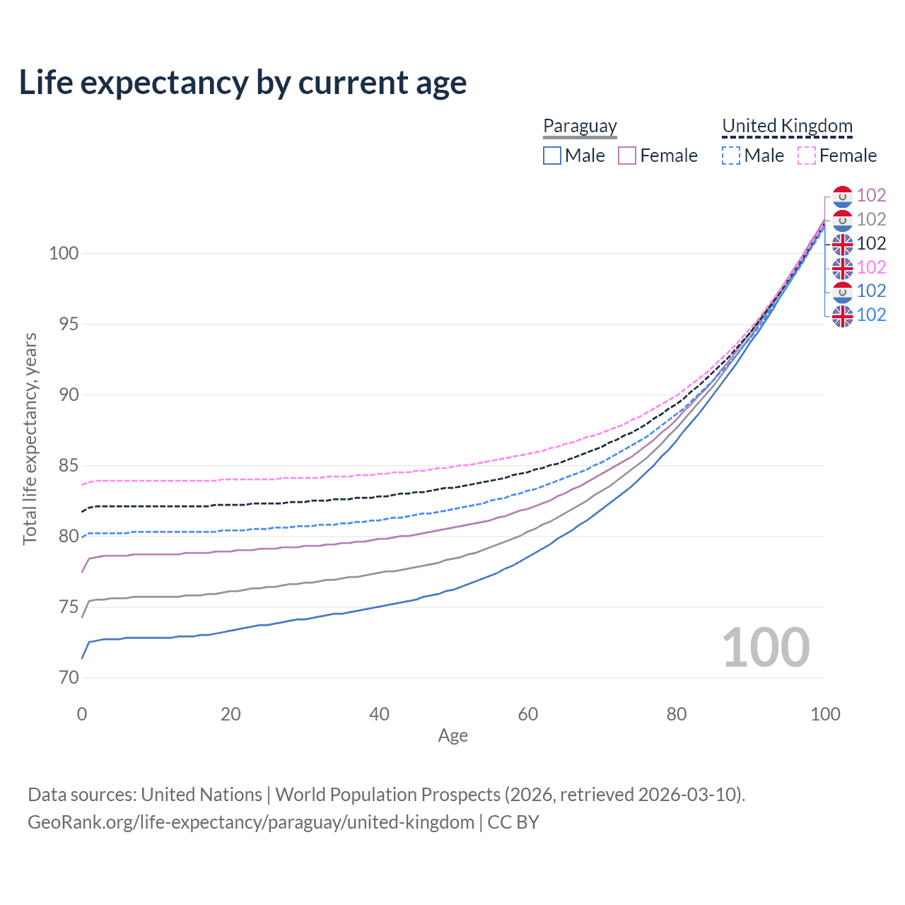 This life expectancy calculator shows the odds of living to 100, 95, 90, and below based on current age for both males and females in Paraguay and the United Kingdom, along with mean and median age of death. The calculations are based on the 2026 life tables (actuarial tables) from the UN World Population Prospects.