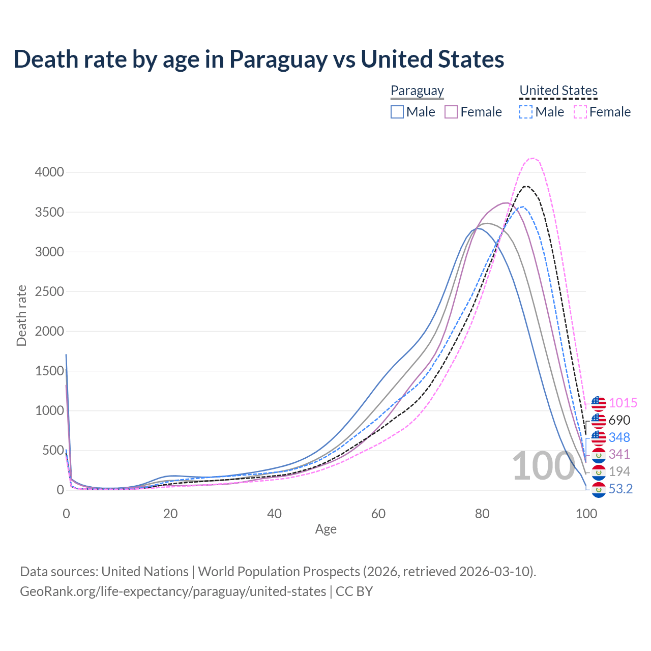 In Paraguay, the most common age of death is 81, compared to 89 in the United States. The median age of death is 78.4 in Paraguay and 83.9 in the United States, meaning only half of each cohort is expected to live past that age.