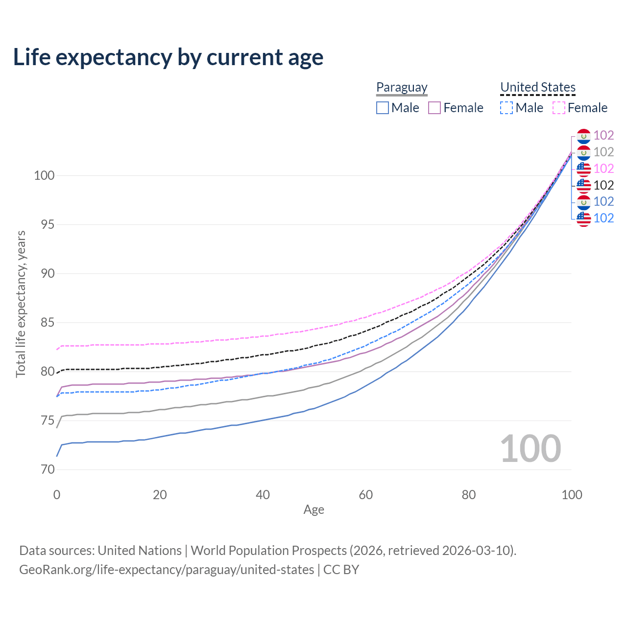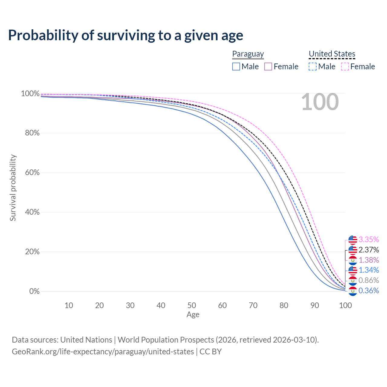 This life expectancy calculator shows the odds of living to 100, 95, 90, and below based on current age for both males and females in Paraguay and the United States, along with mean and median age of death. The calculations are based on the 2026 life tables (actuarial tables) from the UN World Population Prospects.