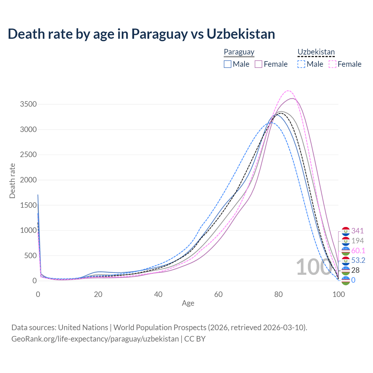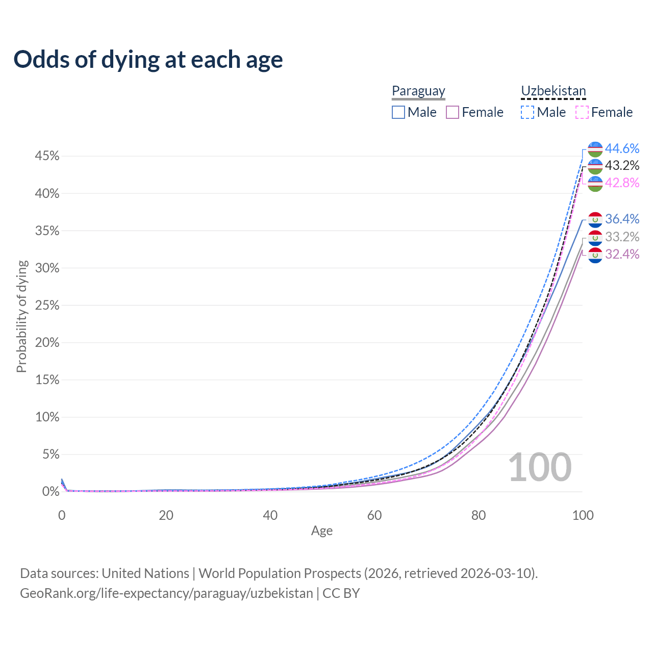 This life expectancy calculator shows the odds of living to 100, 95, 90, and below based on current age for both males and females in Paraguay and Uzbekistan, along with mean and median age of death. The calculations are based on the 2026 life tables (actuarial tables) from the UN World Population Prospects.