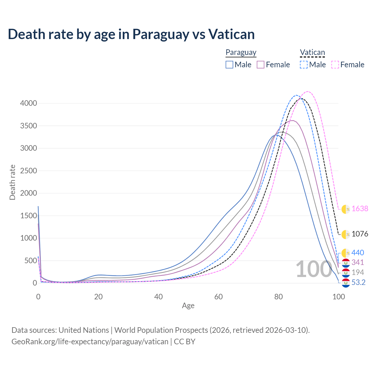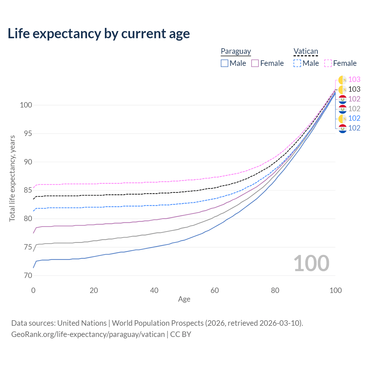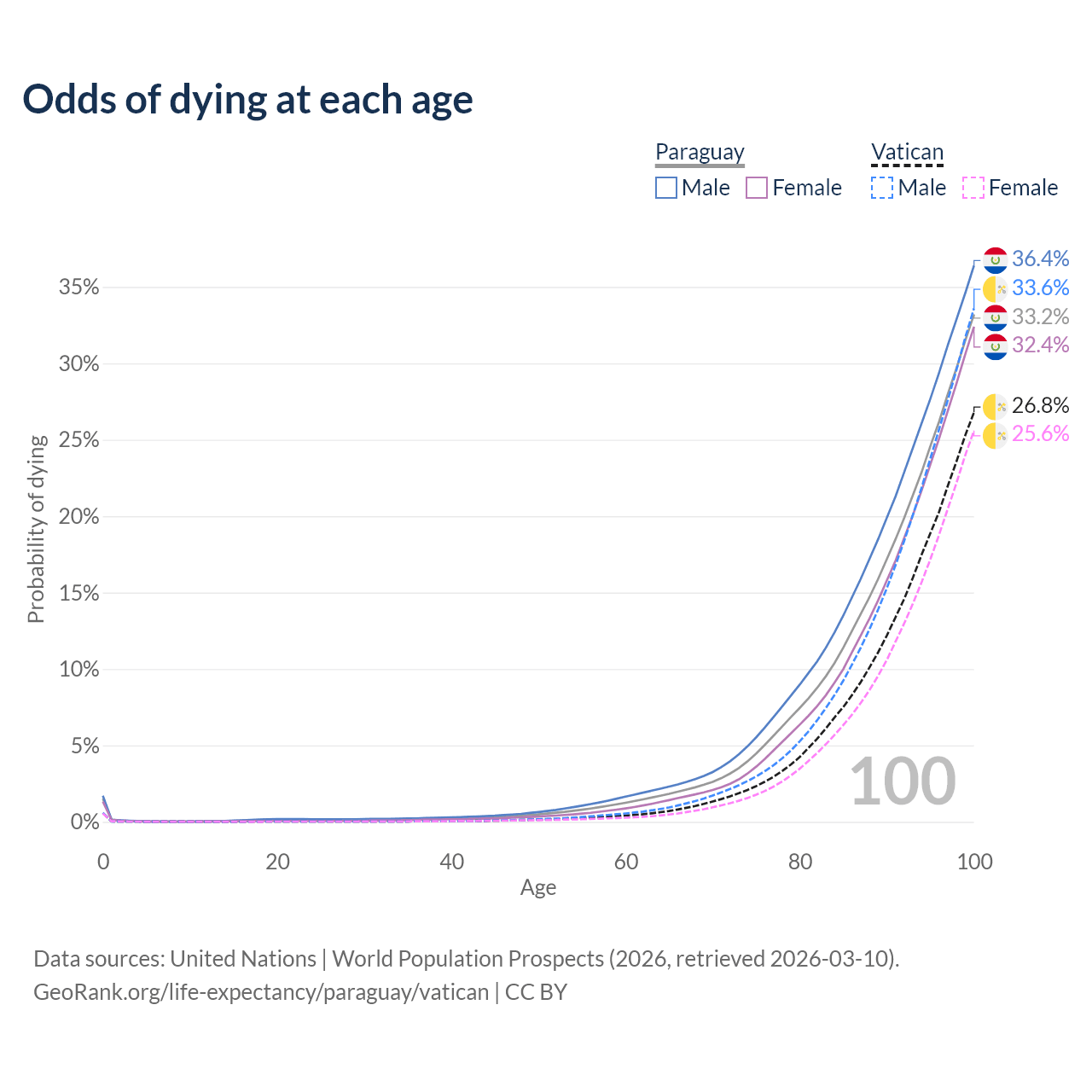 This life expectancy calculator shows the odds of living to 100, 95, 90, and below based on current age for both males and females in Paraguay and the Vatican, along with mean and median age of death. The calculations are based on the 2026 life tables (actuarial tables) from the UN World Population Prospects.