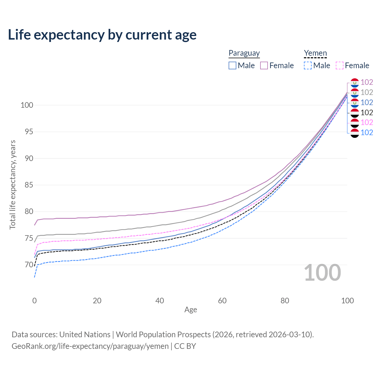 This life expectancy calculator shows the odds of living to 100, 95, 90, and below based on current age for both males and females in Paraguay and Yemen, along with mean and median age of death. The calculations are based on the 2026 life tables (actuarial tables) from the UN World Population Prospects.