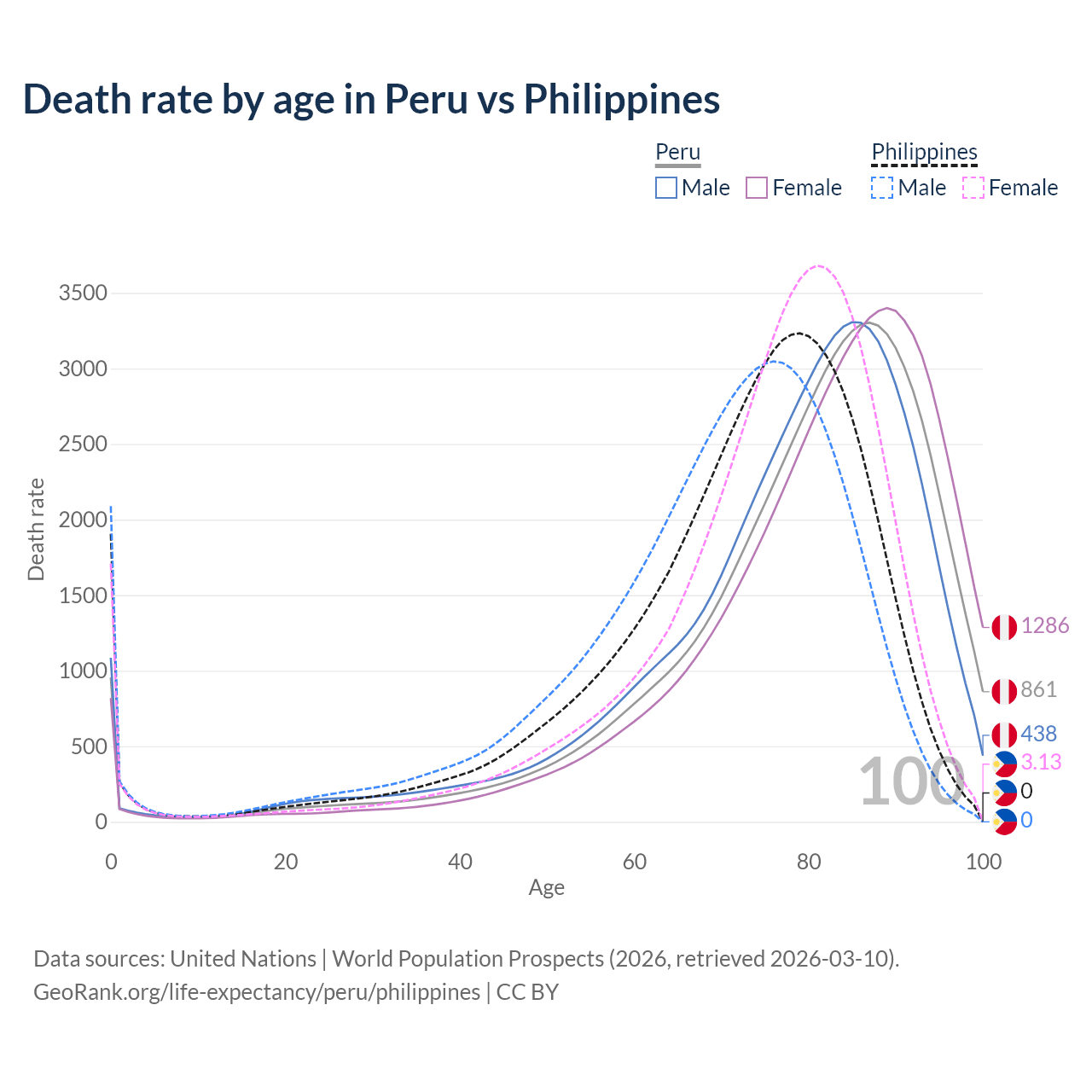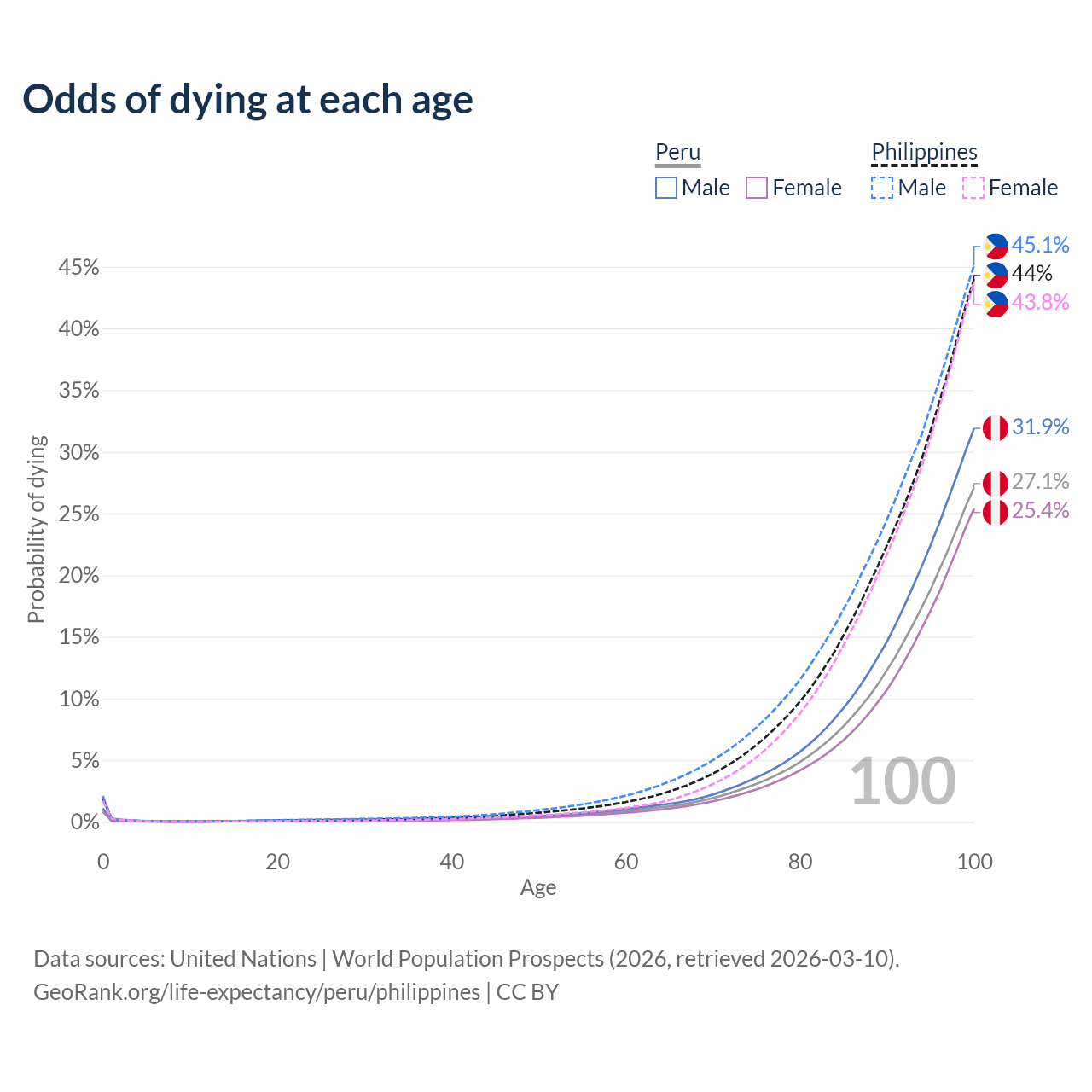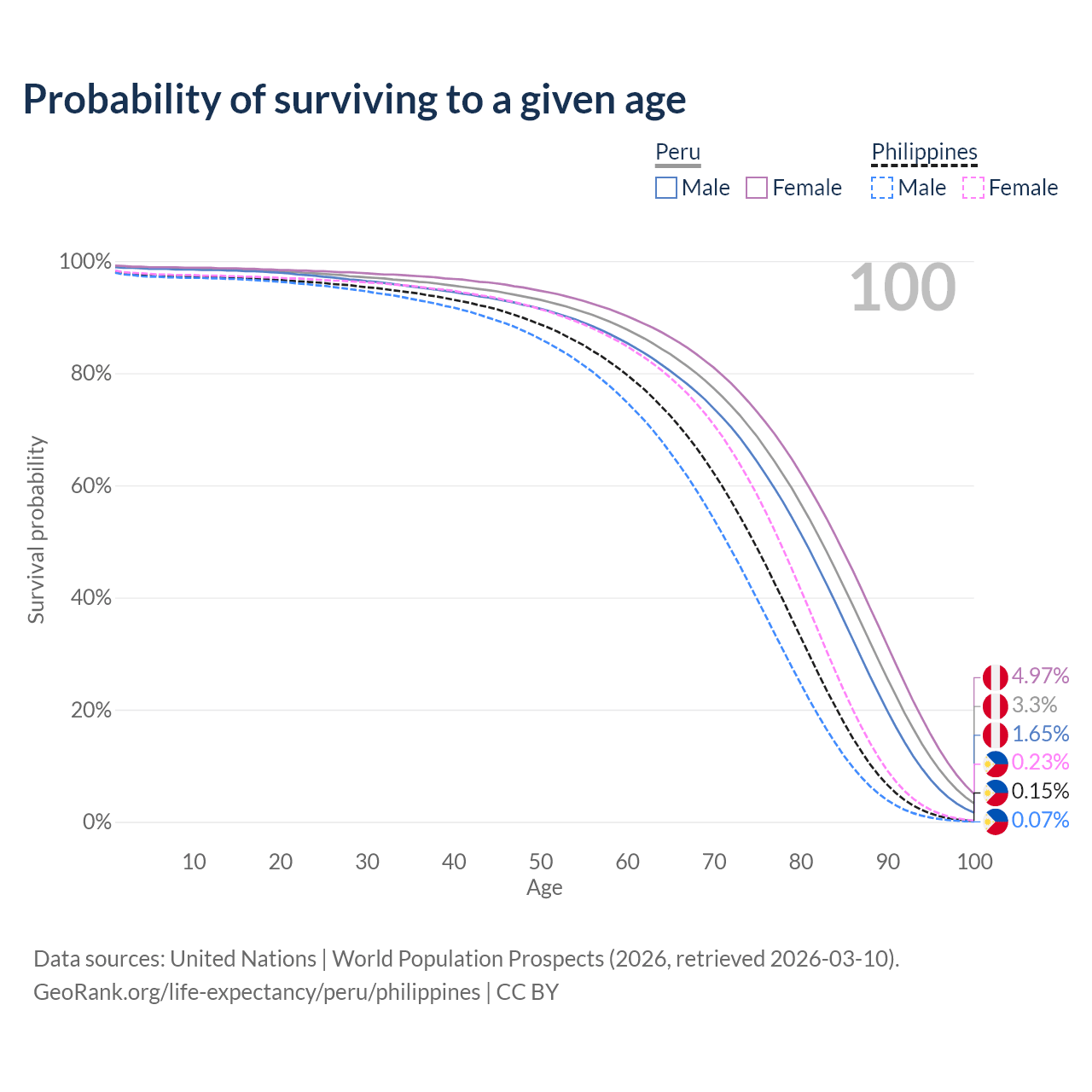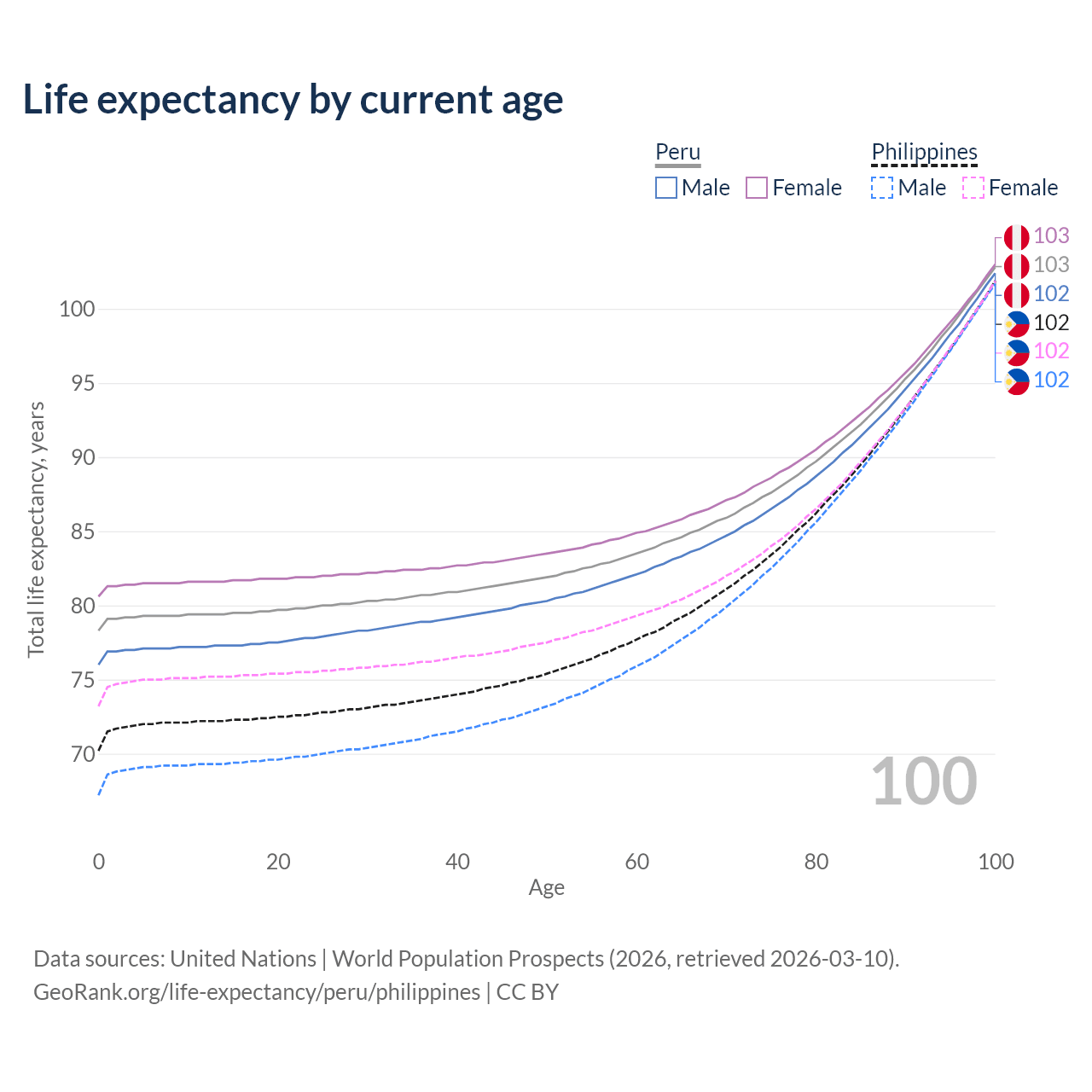 This life expectancy calculator shows the odds of living to 100, 95, 90, and below based on current age for both males and females in Peru and the Philippines, along with mean and median age of death. The calculations are based on the 2026 life tables (actuarial tables) from the UN World Population Prospects.