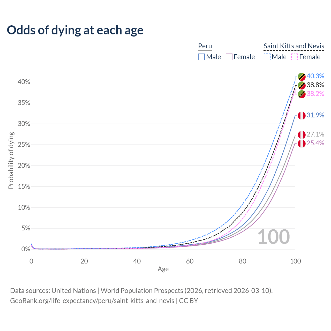 This life expectancy calculator shows the odds of living to 100, 95, 90, and below based on current age for both males and females in Peru and Saint Kitts and Nevis, along with mean and median age of death. The calculations are based on the 2026 life tables (actuarial tables) from the UN World Population Prospects.