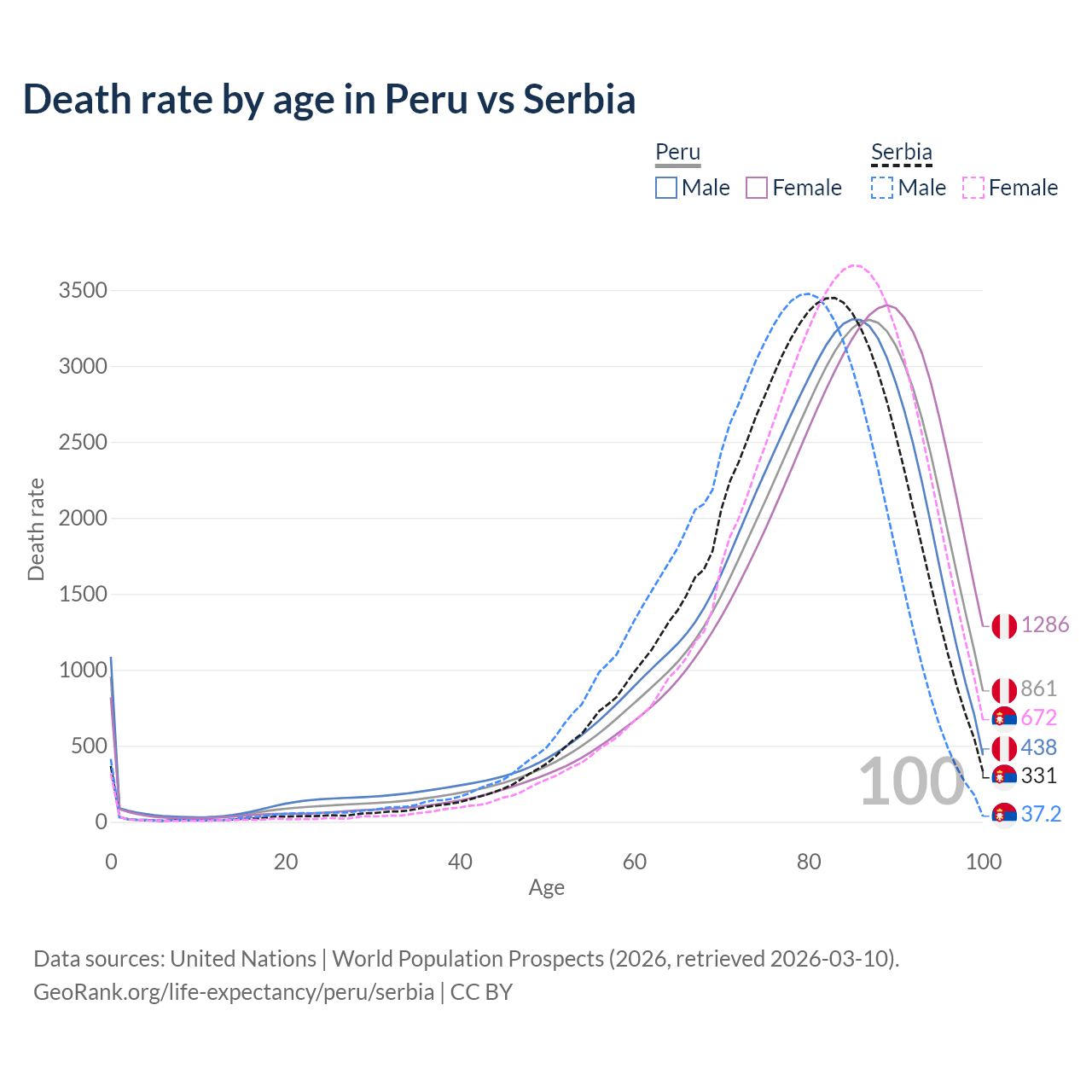 This life expectancy calculator shows the odds of living to 100, 95, 90, and below based on current age for both males and females in Peru and Serbia, along with mean and median age of death. The calculations are based on the 2026 life tables (actuarial tables) from the UN World Population Prospects.