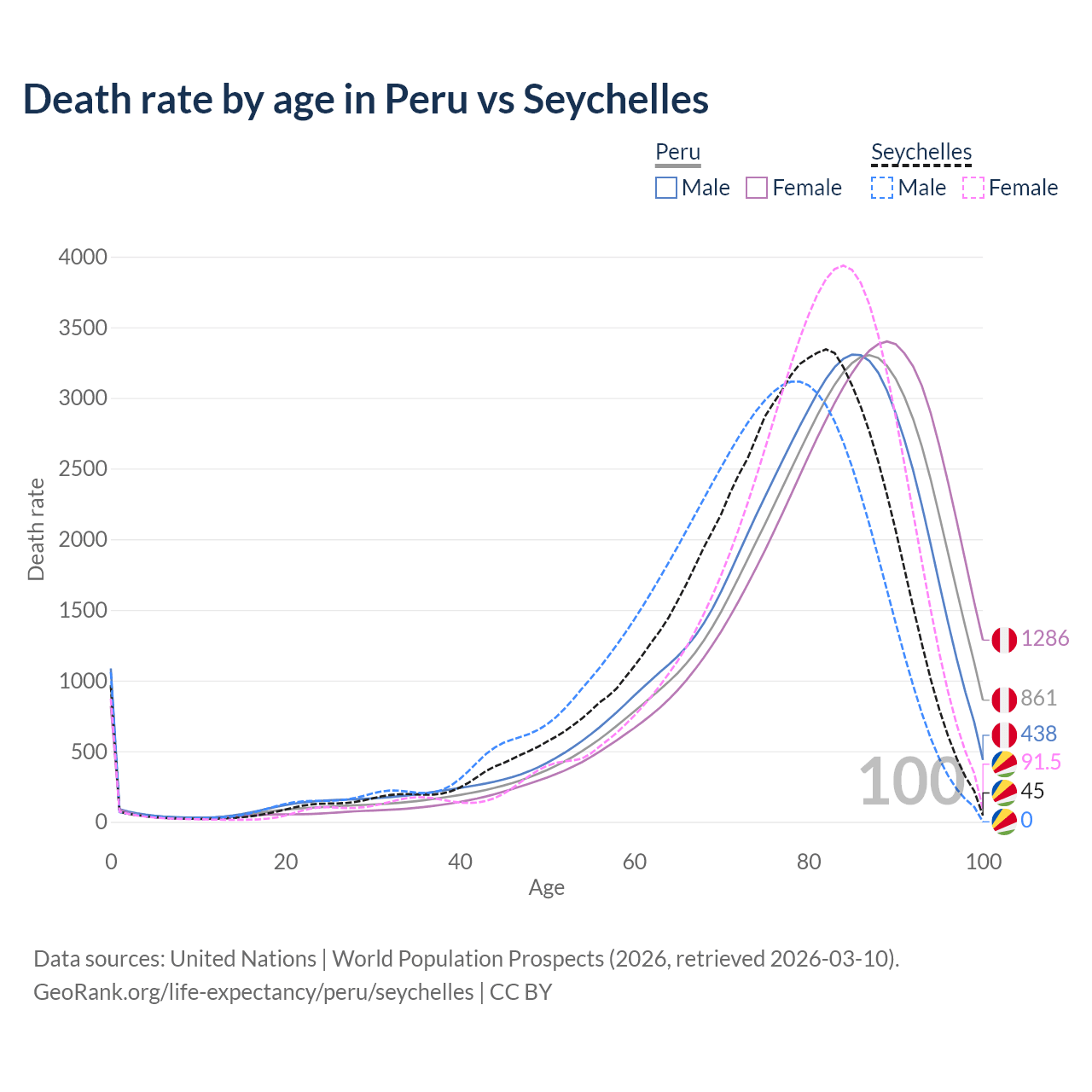 In Peru, the most common age of death is 87, compared to 82 in the Seychelles. The median age of death is 82.4 in Peru and 77 in the Seychelles, meaning only half of each cohort is expected to live past that age.
