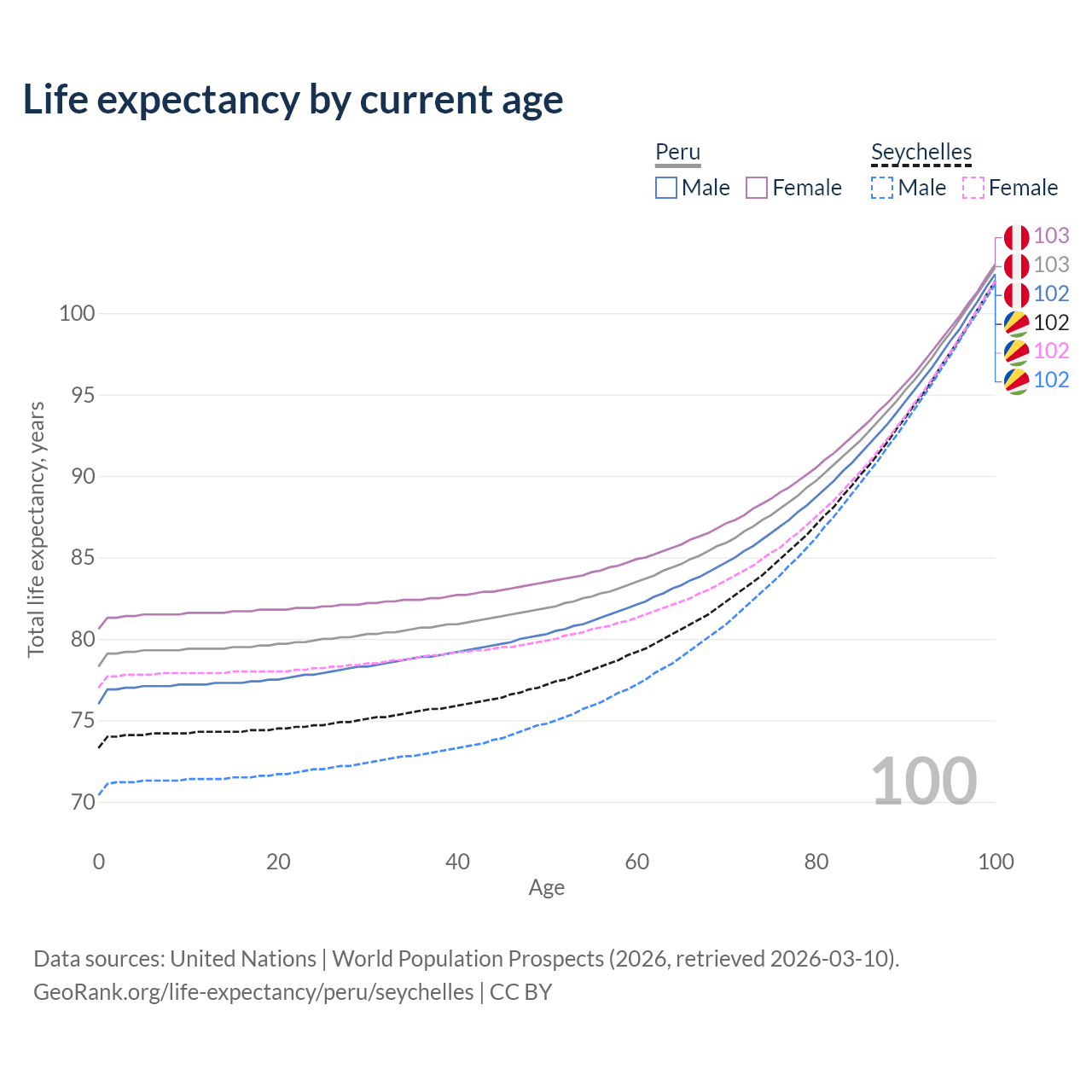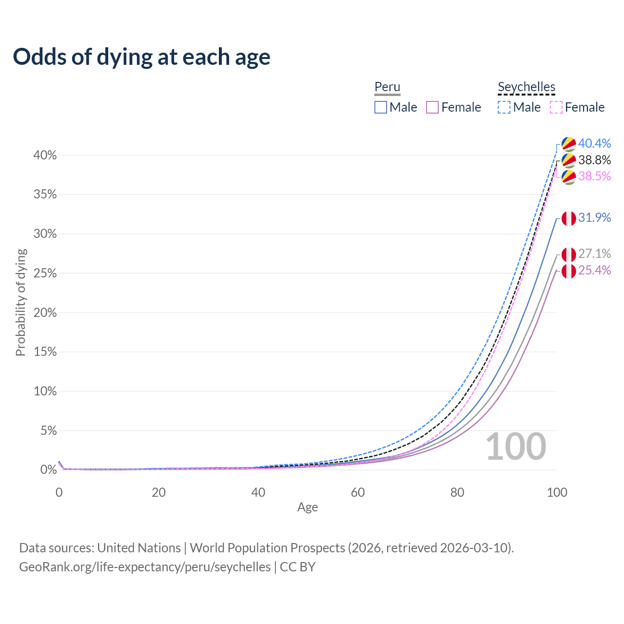 This life expectancy calculator shows the odds of living to 100, 95, 90, and below based on current age for both males and females in Peru and the Seychelles, along with mean and median age of death. The calculations are based on the 2026 life tables (actuarial tables) from the UN World Population Prospects.