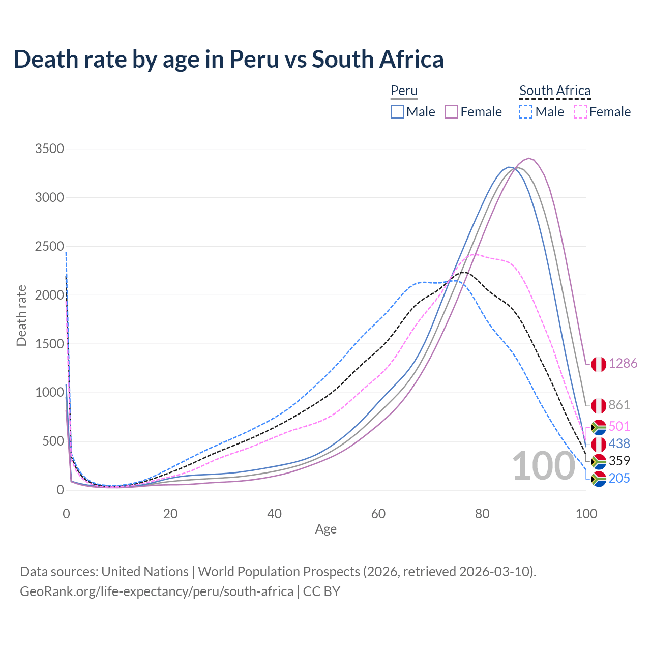 In Peru, the most common age of death is 87, compared to 77 in South Africa. The median age of death is 82.4 in Peru and 70.8 in South Africa, meaning only half of each cohort is expected to live past that age.