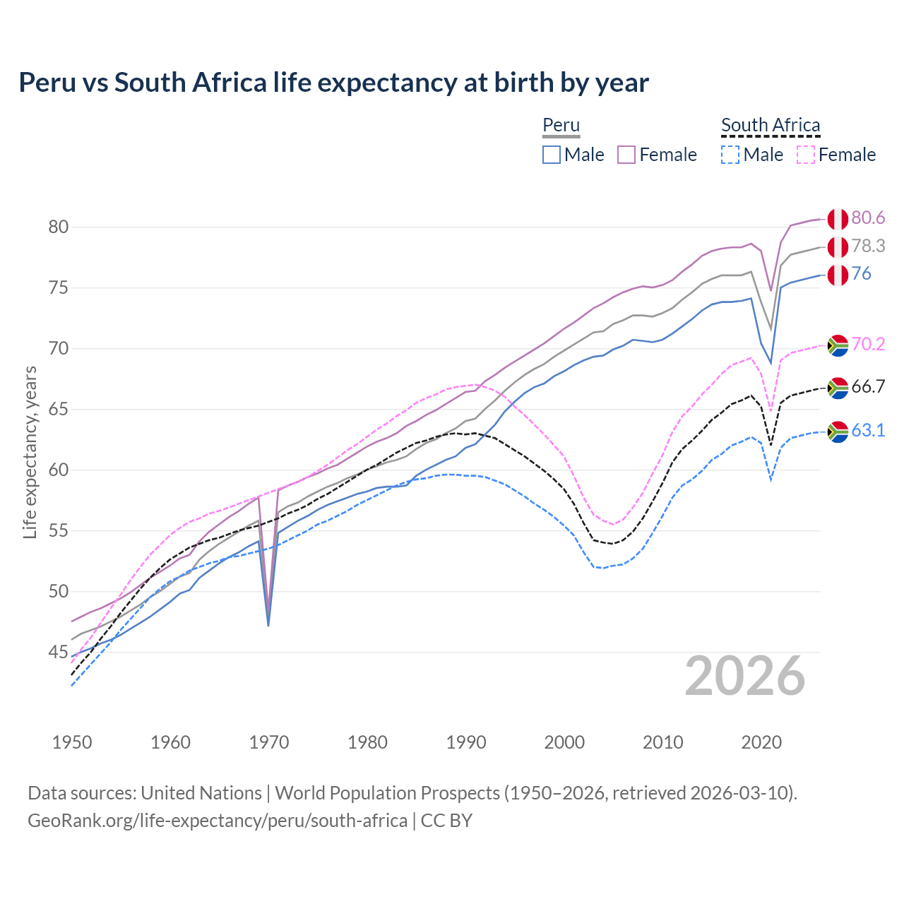 The average life expectancy at birth is 78.3 years in Peru vs 66.7 in South Africa. Peru is ranked 59/197 by life expectancy, and South Africa is 164/197. In Peru, the life expectancy is 76 years for males and 80.6 years for females. In South Africa, it's 63.1 years for males and 70.2 years for females.