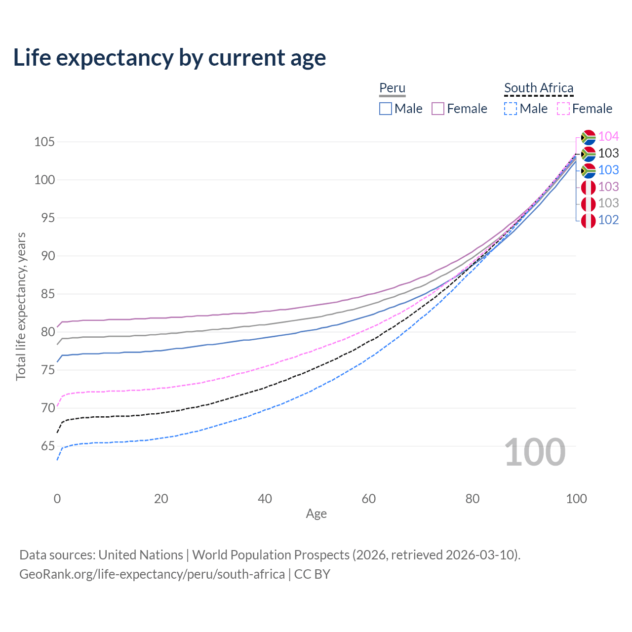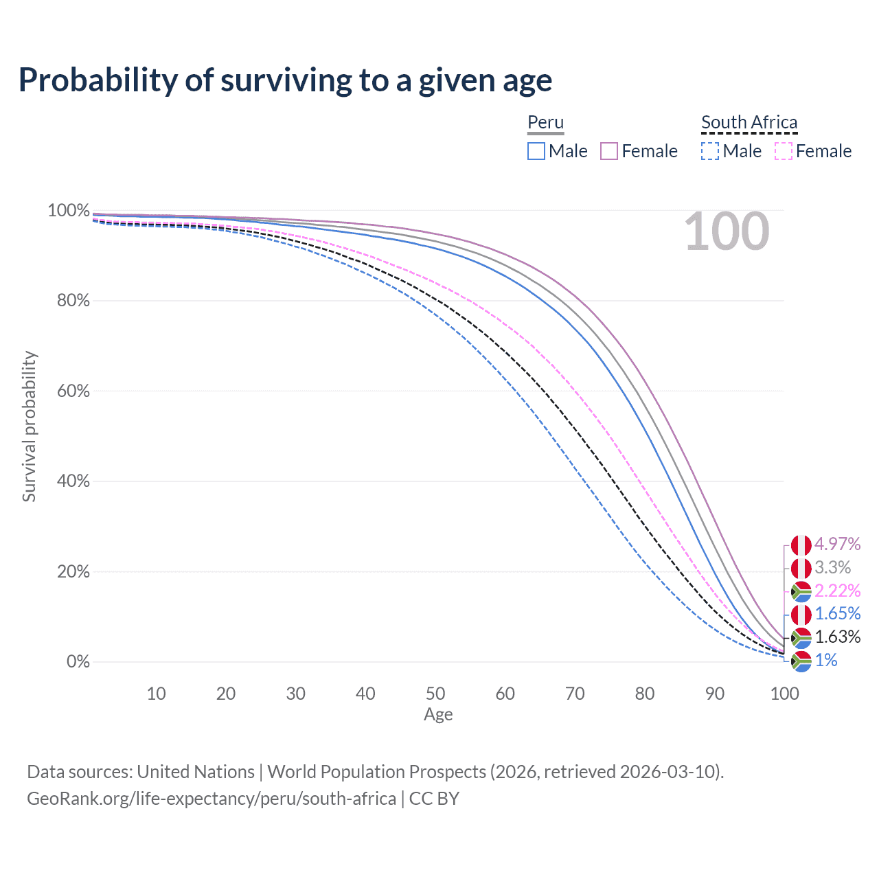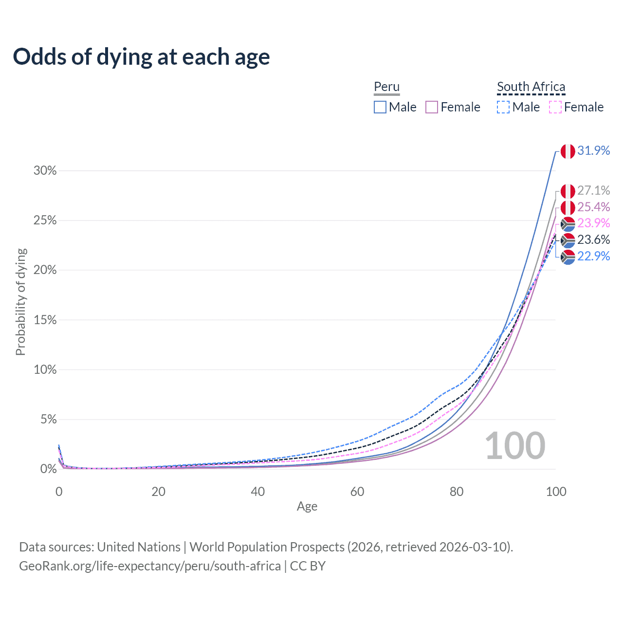 This life expectancy calculator shows the odds of living to 100, 95, 90, and below based on current age for both males and females in Peru and South Africa, along with mean and median age of death. The calculations are based on the 2026 life tables (actuarial tables) from the UN World Population Prospects.
