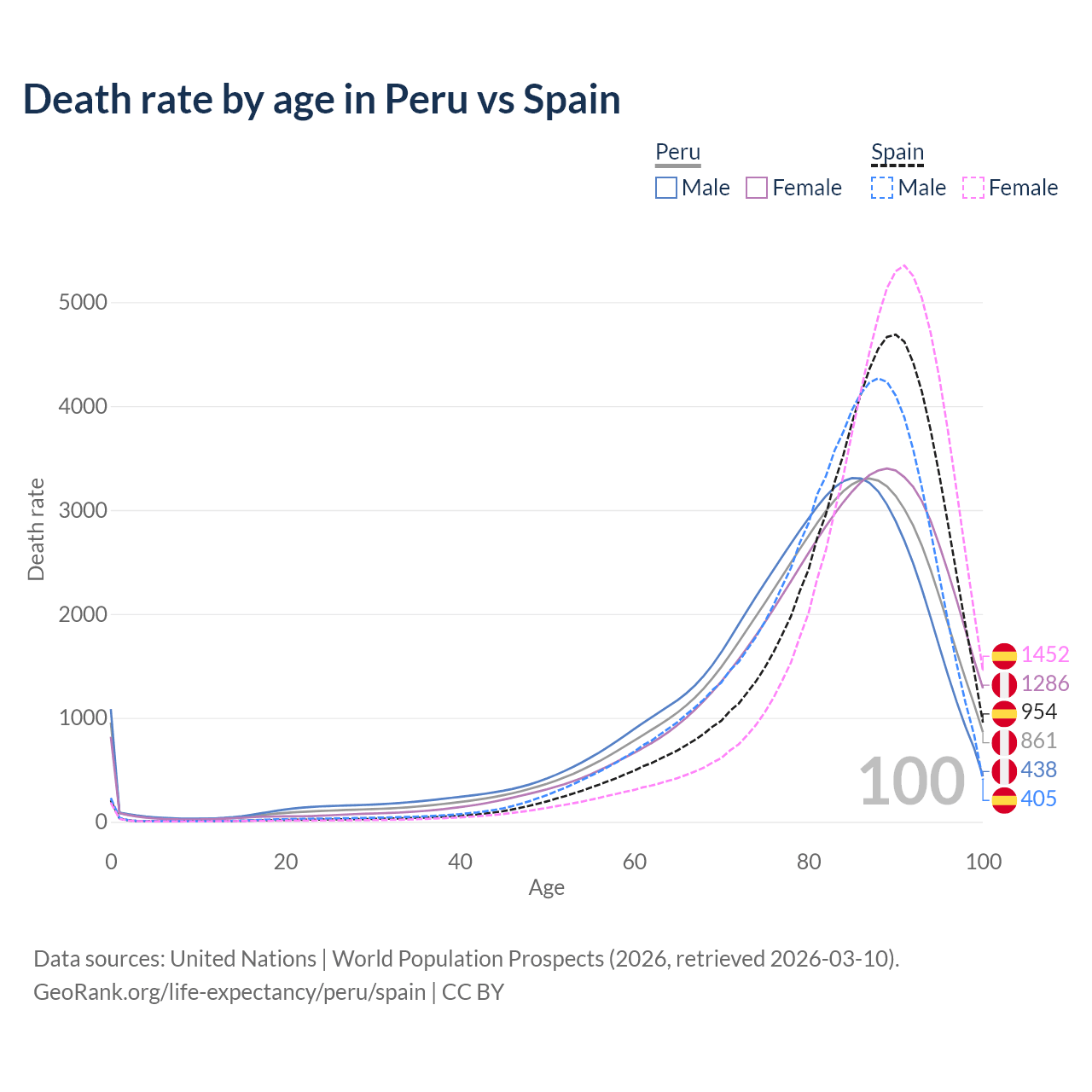 In Peru, the most common age of death is 87, compared to 90 in Spain. The median age of death is 82.4 in Peru and 87 in Spain, meaning only half of each cohort is expected to live past that age.