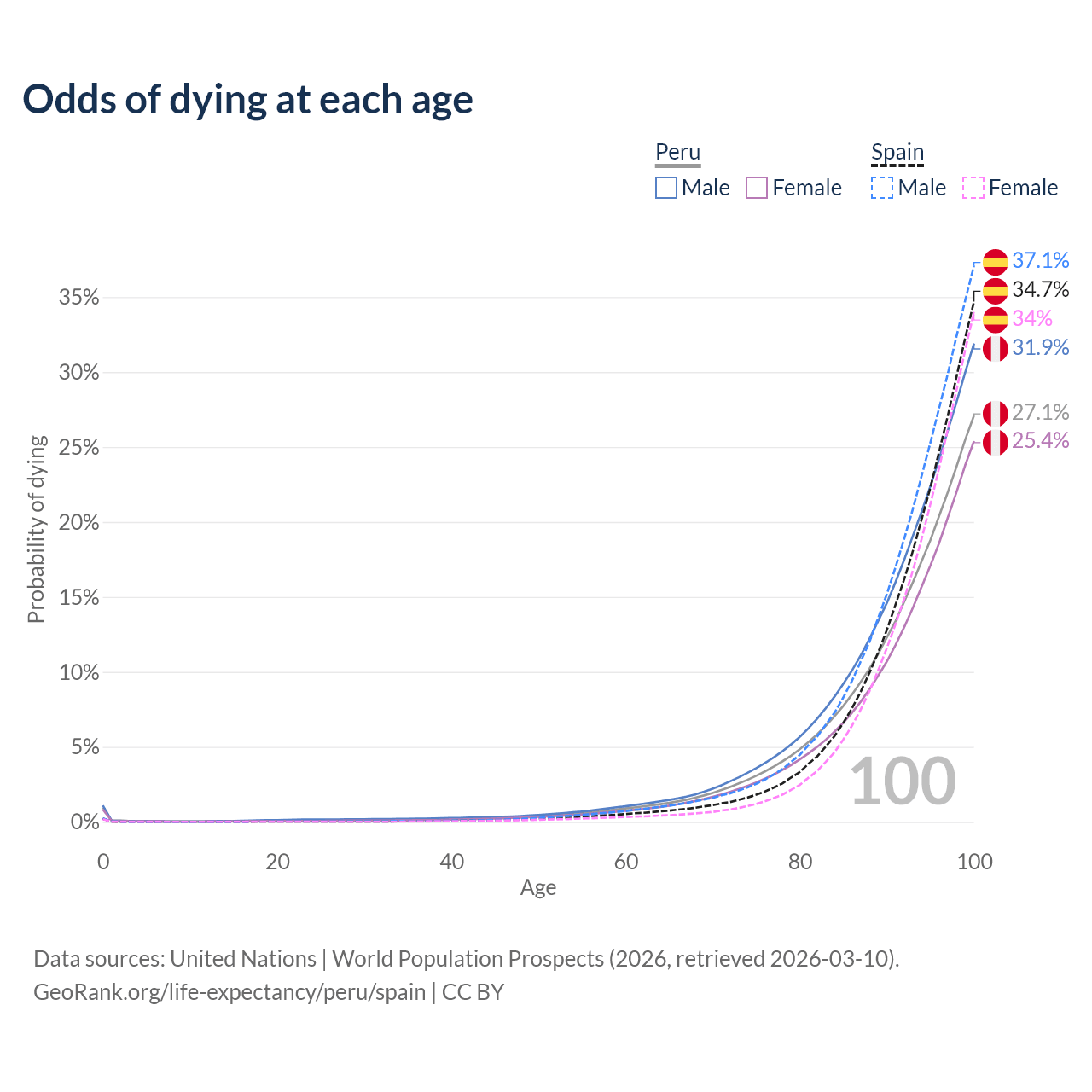 This life expectancy calculator shows the odds of living to 100, 95, 90, and below based on current age for both males and females in Peru and Spain, along with mean and median age of death. The calculations are based on the 2026 life tables (actuarial tables) from the UN World Population Prospects.