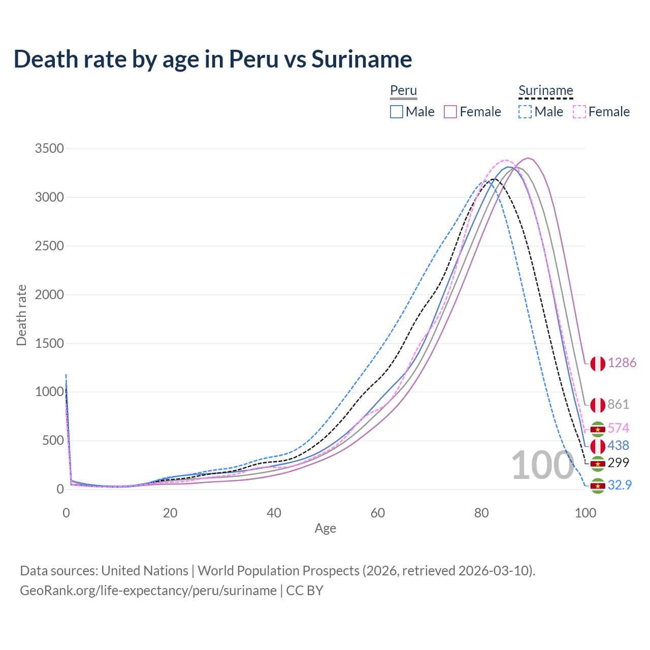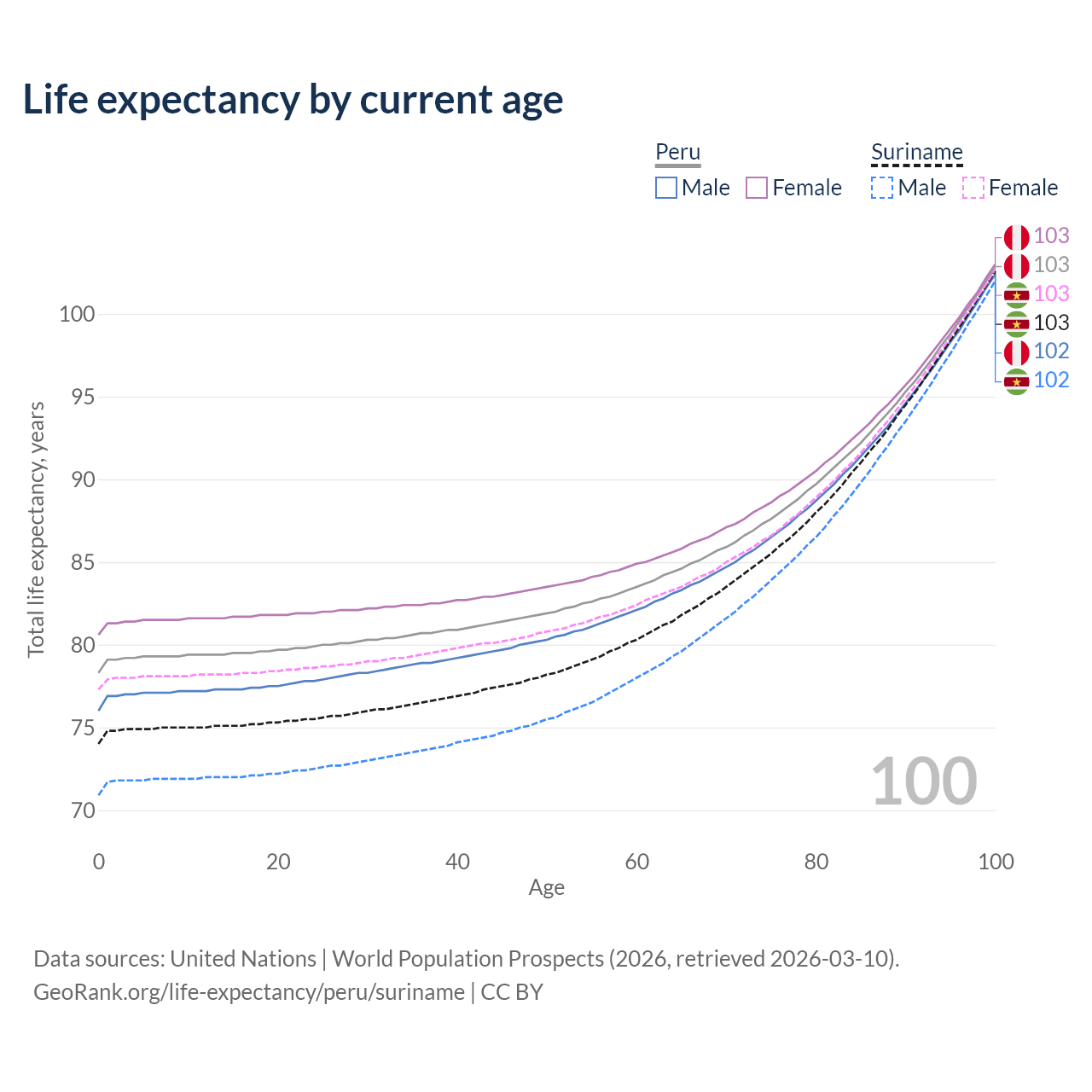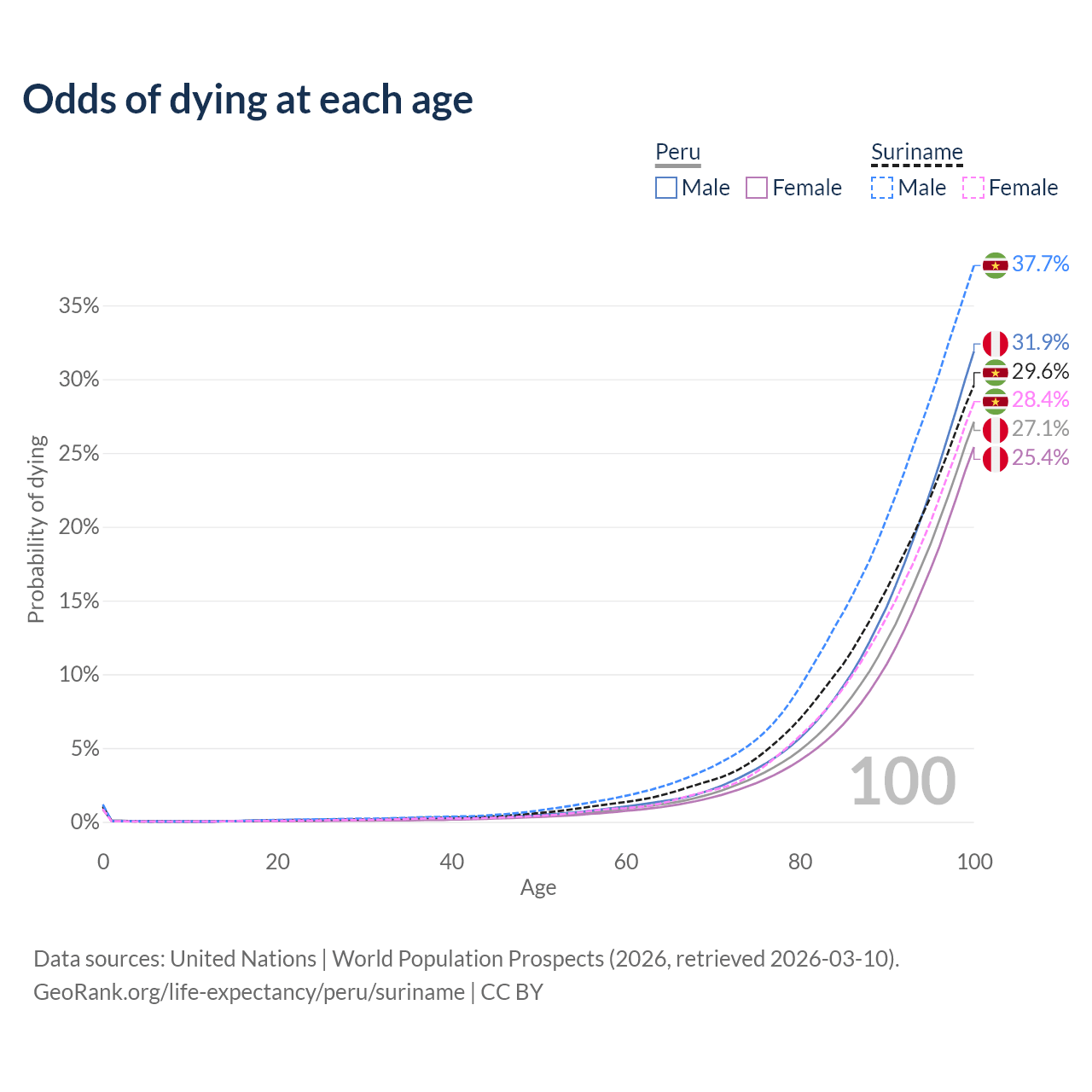 This life expectancy calculator shows the odds of living to 100, 95, 90, and below based on current age for both males and females in Peru and Suriname, along with mean and median age of death. The calculations are based on the 2026 life tables (actuarial tables) from the UN World Population Prospects.