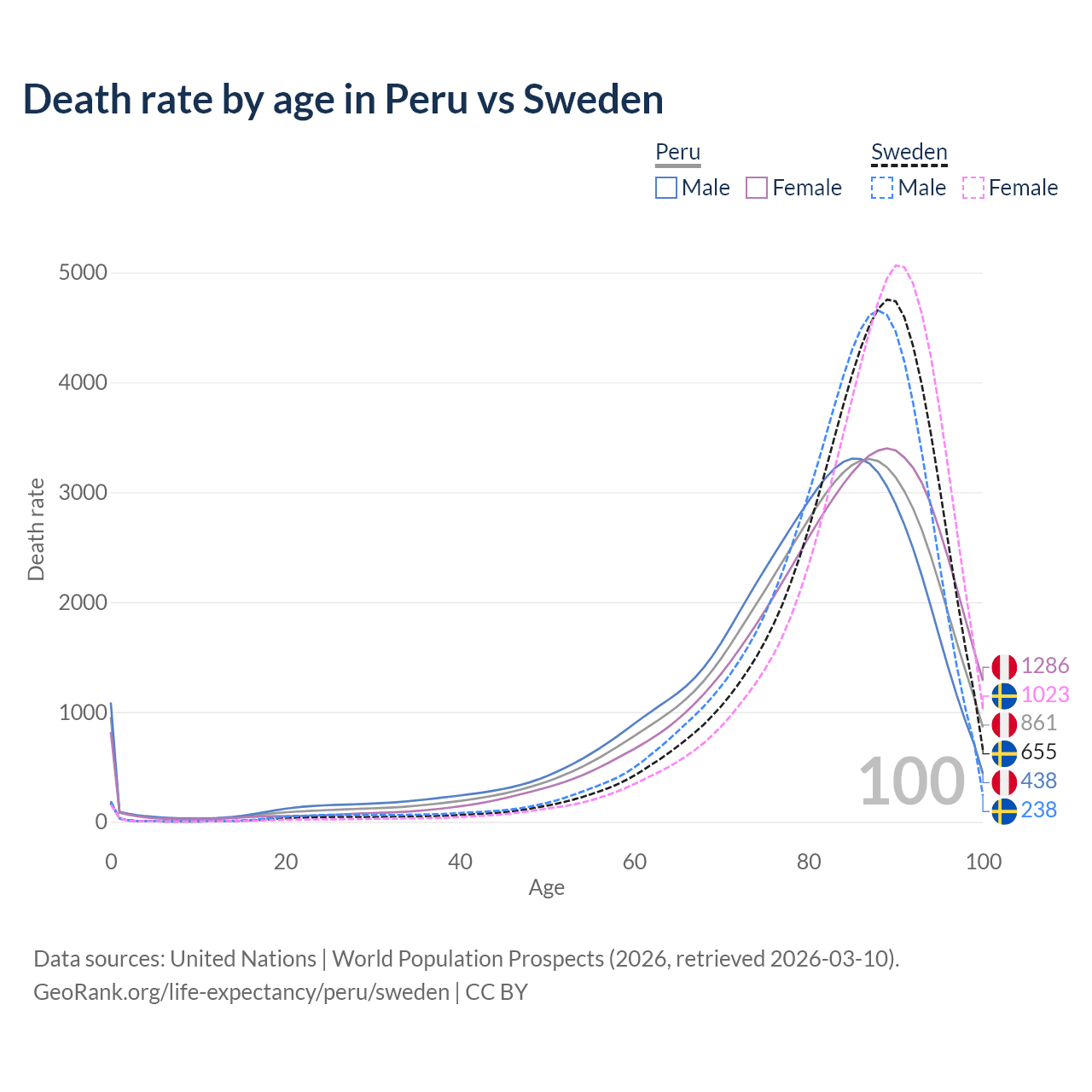 In Peru, the most common age of death is 87, compared to 89 in Sweden. The median age of death is 82.4 in Peru and 86.5 in Sweden, meaning only half of each cohort is expected to live past that age.