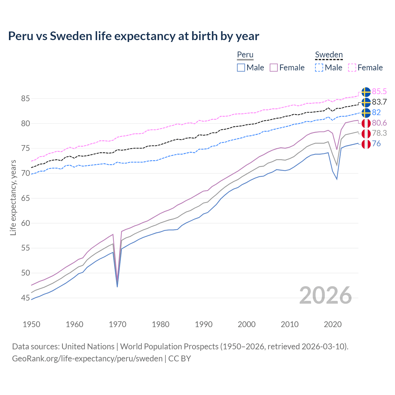 The average life expectancy at birth is 78.3 years in Peru vs 83.7 in Sweden. Peru is ranked 59/197 by life expectancy, and Sweden is 14/197. In Peru, the life expectancy is 76 years for males and 80.6 years for females. In Sweden, it's 82 years for males and 85.5 years for females.