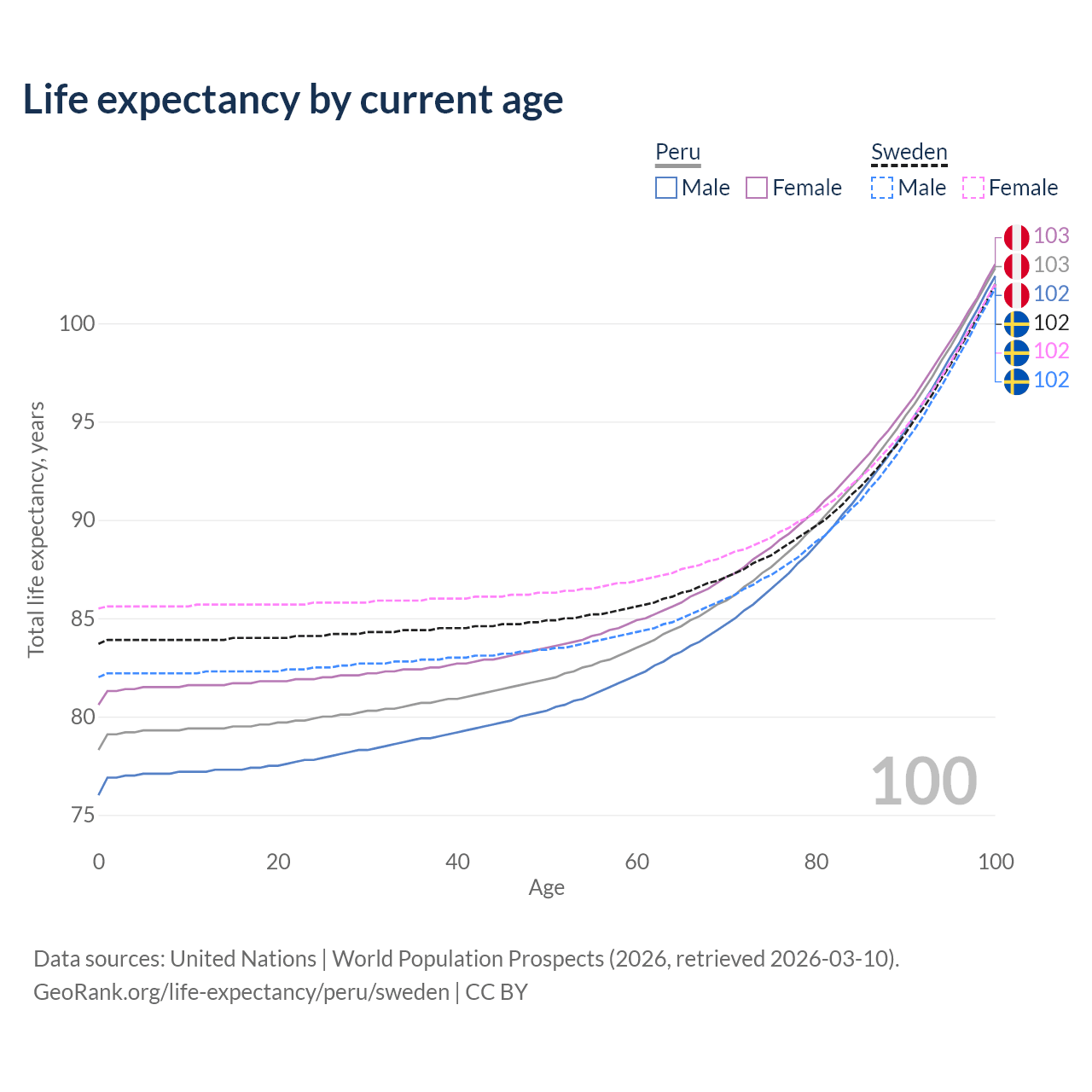 This life expectancy calculator shows the odds of living to 100, 95, 90, and below based on current age for both males and females in Peru and Sweden, along with mean and median age of death. The calculations are based on the 2026 life tables (actuarial tables) from the UN World Population Prospects.