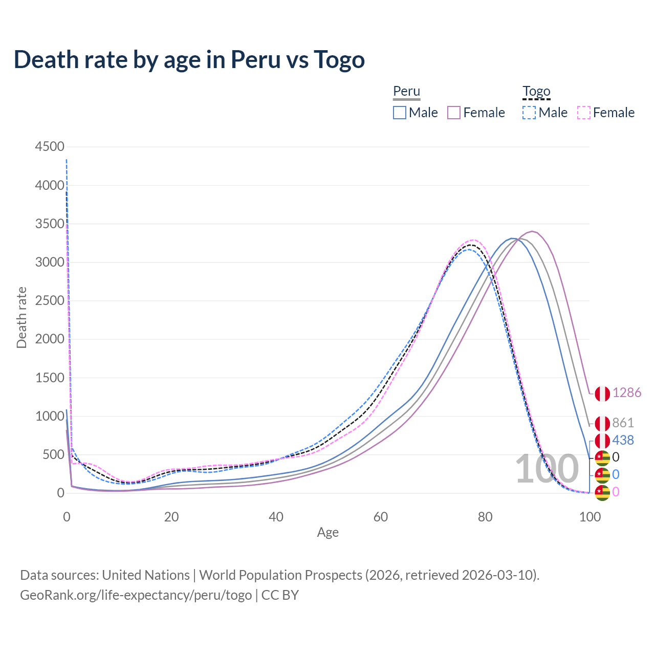 In Peru, the most common age of death is 87, compared to 0 in Togo. The median age of death is 82.4 in Peru and 71 in Togo, meaning only half of each cohort is expected to live past that age.