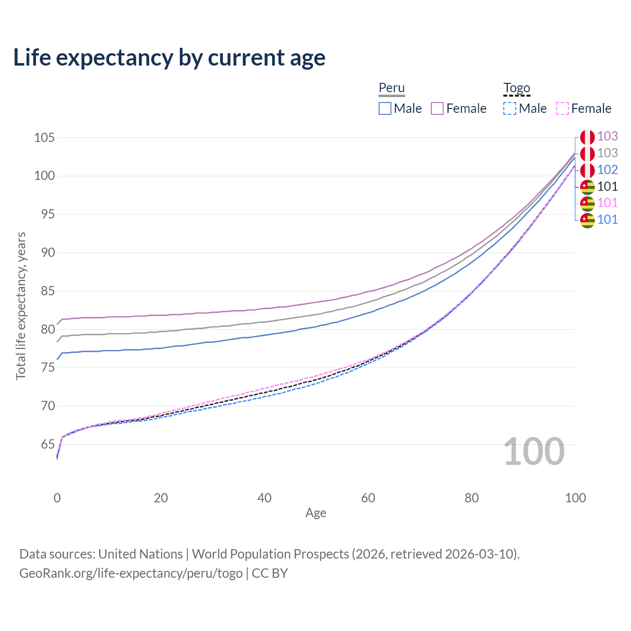 The average life expectancy at birth is 78.3 years in Peru vs 63.3 in Togo. Peru is ranked 59/197 by life expectancy, and Togo is 181/197. In Peru, the life expectancy is 76 years for males and 80.6 years for females. In Togo, it's 63 years for males and 63.6 years for females.