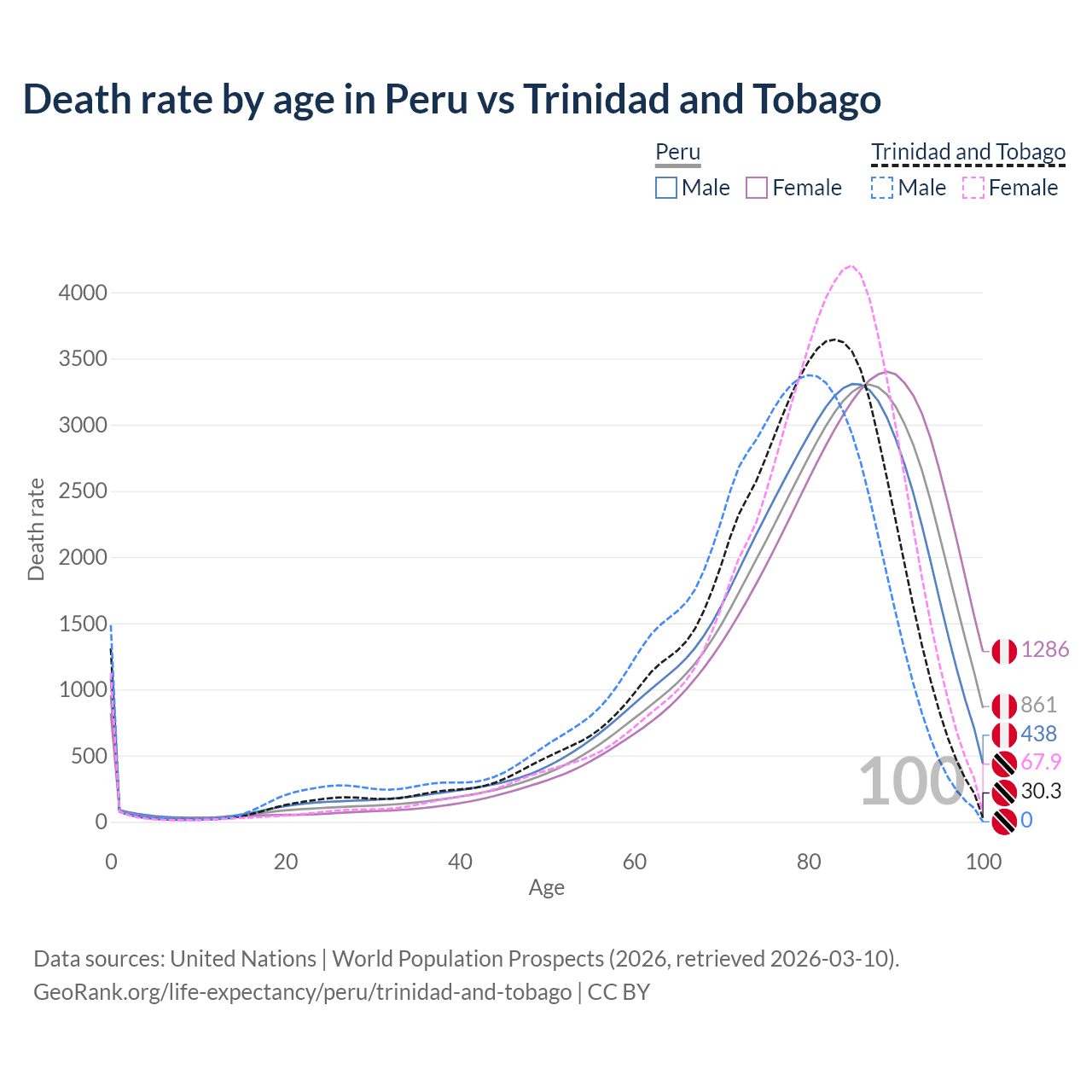 In Peru, the most common age of death is 87, compared to 83 in Trinidad and Tobago. The median age of death is 82.4 in Peru and 78.4 in Trinidad and Tobago, meaning only half of each cohort is expected to live past that age.