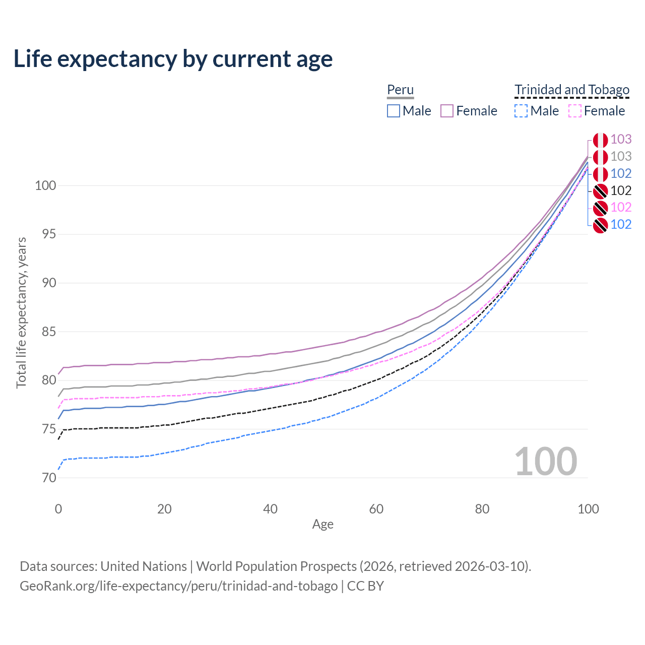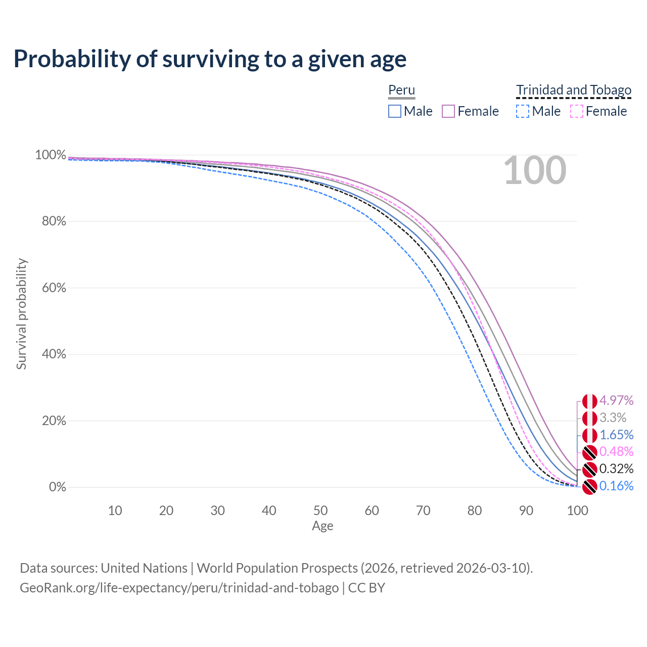This life expectancy calculator shows the odds of living to 100, 95, 90, and below based on current age for both males and females in Peru and Trinidad and Tobago, along with mean and median age of death. The calculations are based on the 2026 life tables (actuarial tables) from the UN World Population Prospects.