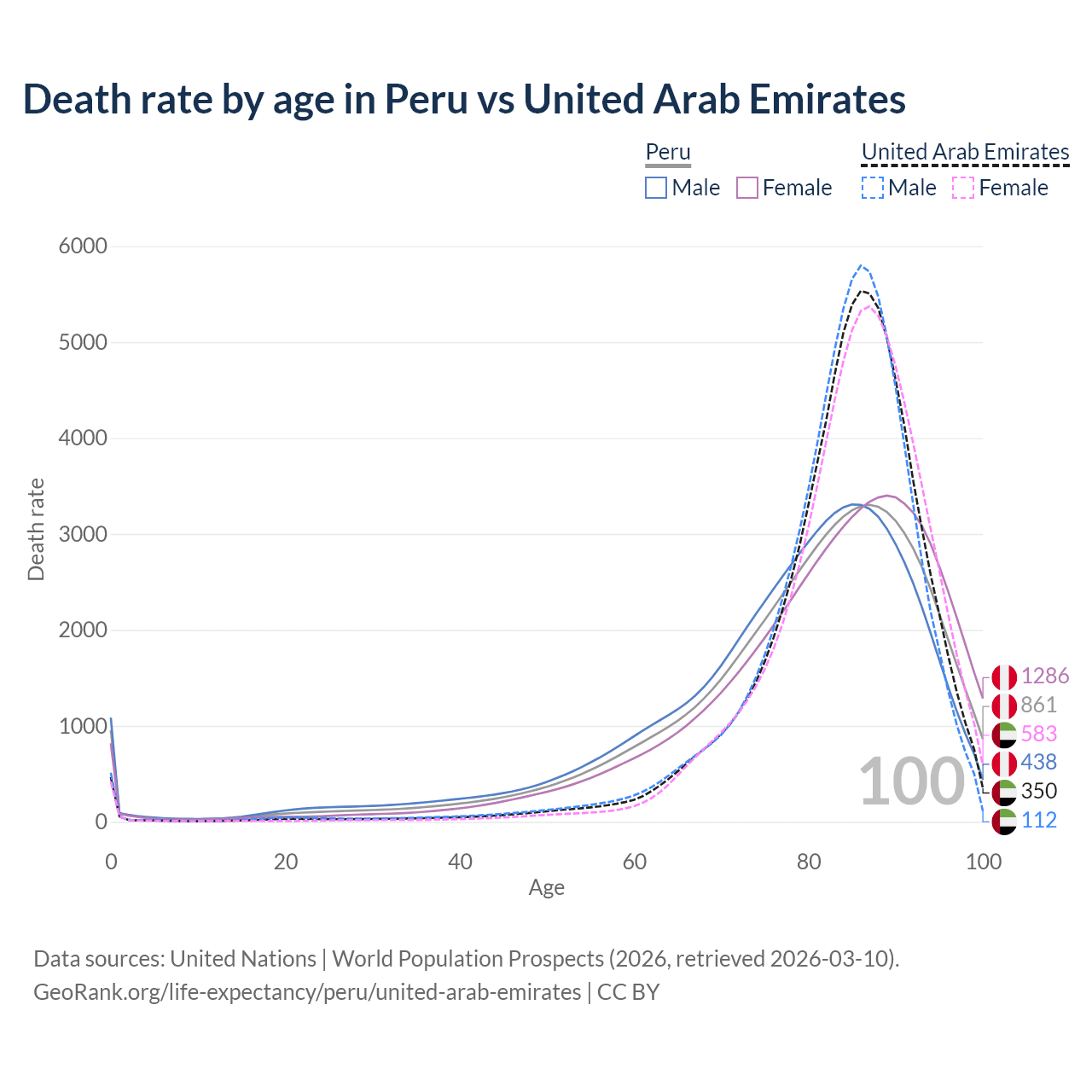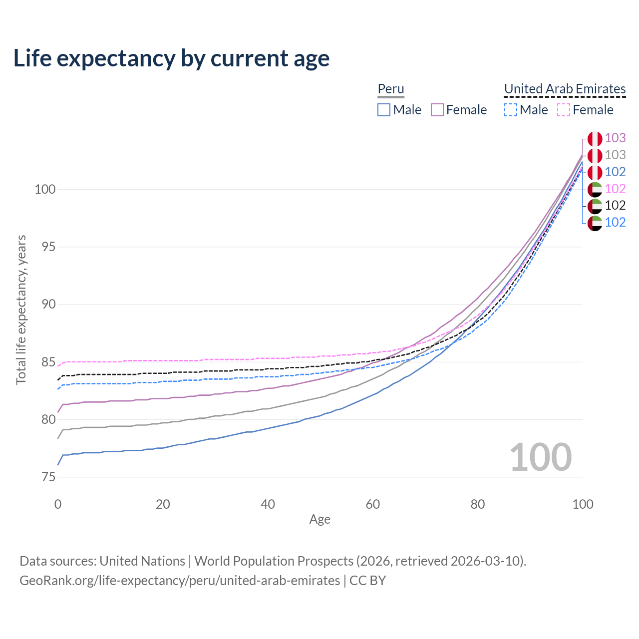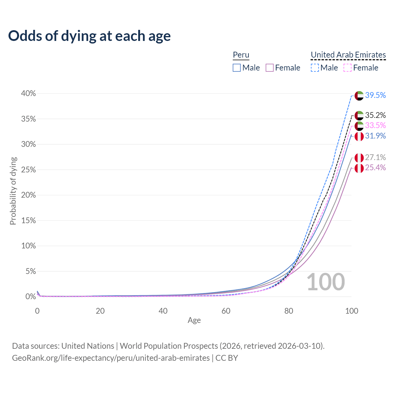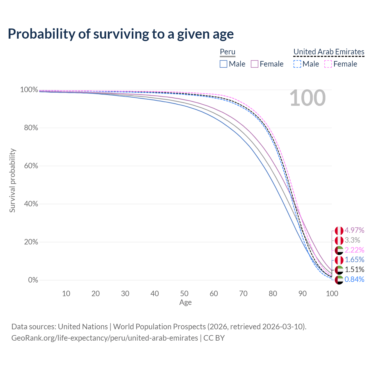 This life expectancy calculator shows the odds of living to 100, 95, 90, and below based on current age for both males and females in Peru and the United Arab Emirates, along with mean and median age of death. The calculations are based on the 2026 life tables (actuarial tables) from the UN World Population Prospects.
