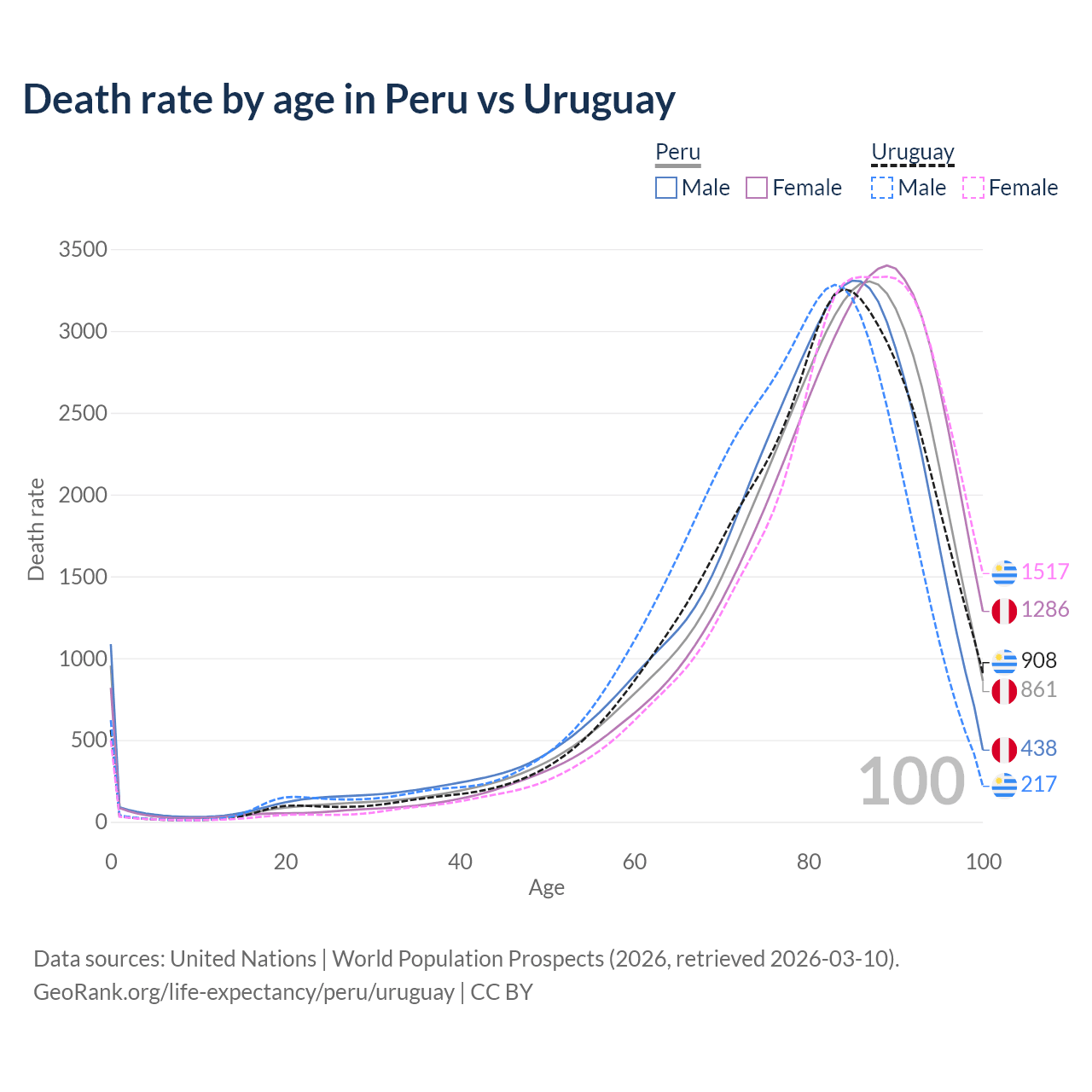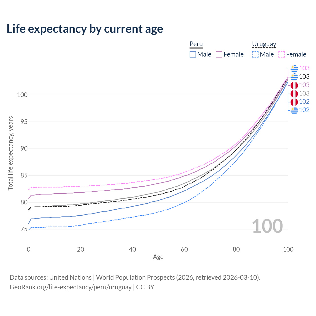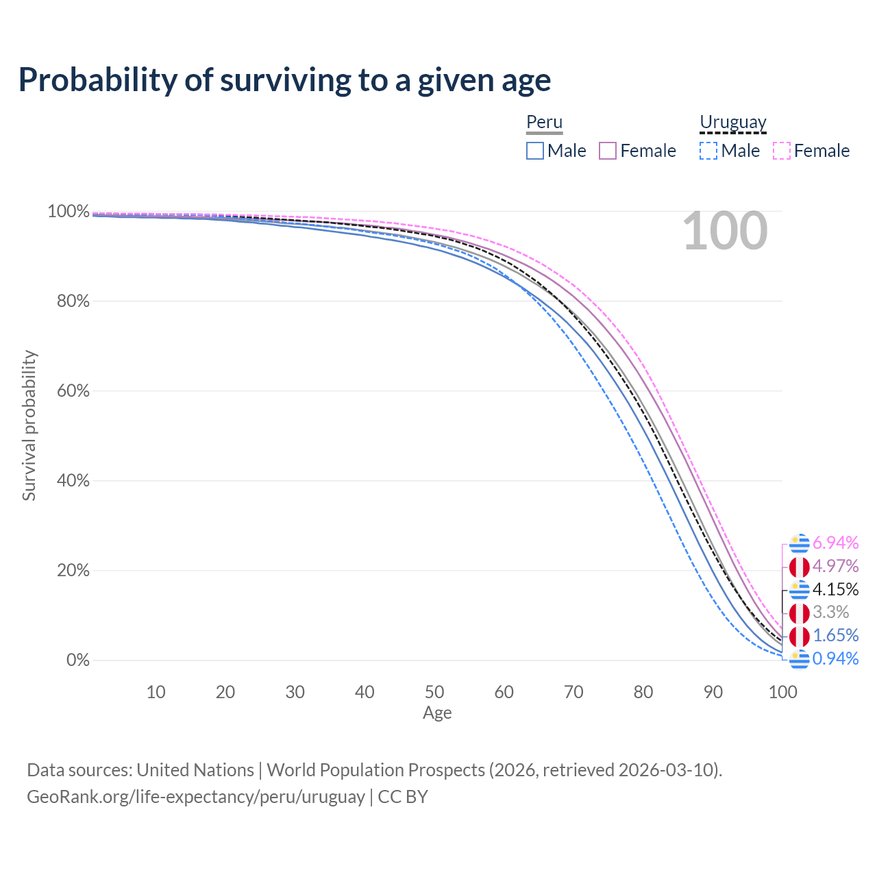 This life expectancy calculator shows the odds of living to 100, 95, 90, and below based on current age for both males and females in Peru and Uruguay, along with mean and median age of death. The calculations are based on the 2026 life tables (actuarial tables) from the UN World Population Prospects.