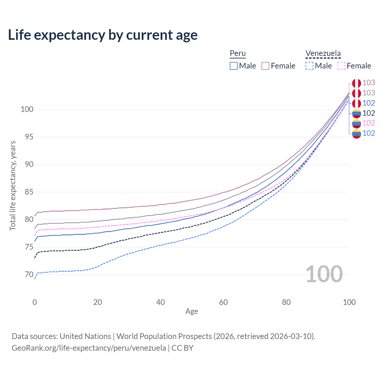 This life expectancy calculator shows the odds of living to 100, 95, 90, and below based on current age for both males and females in Peru and Venezuela, along with mean and median age of death. The calculations are based on the 2026 life tables (actuarial tables) from the UN World Population Prospects.