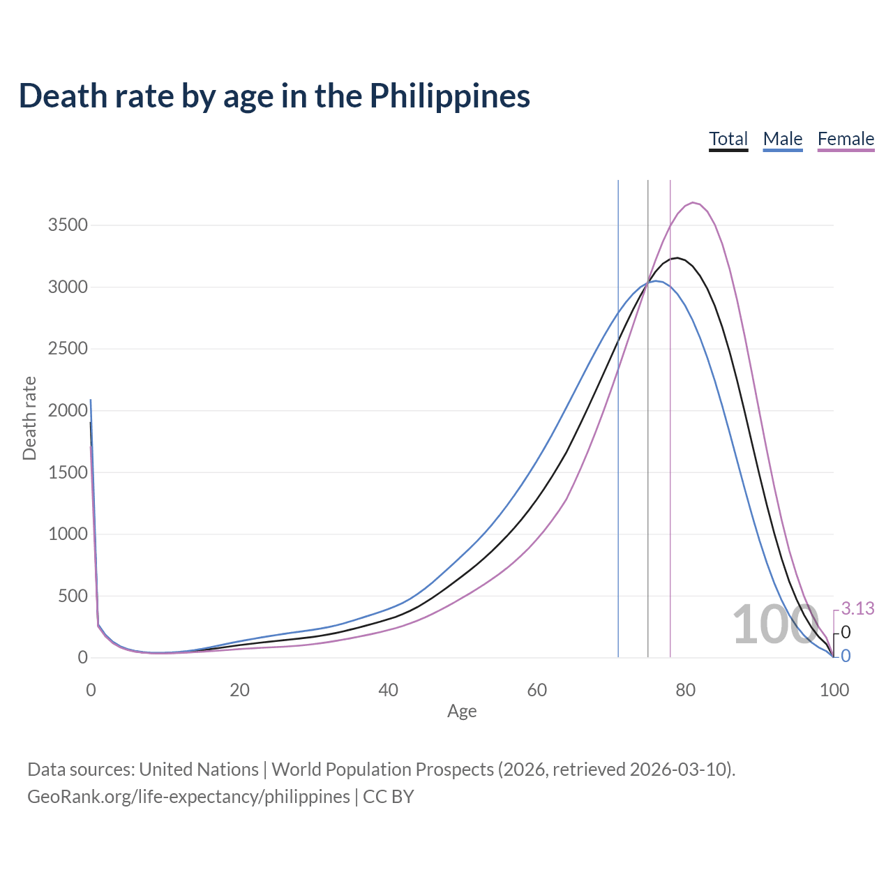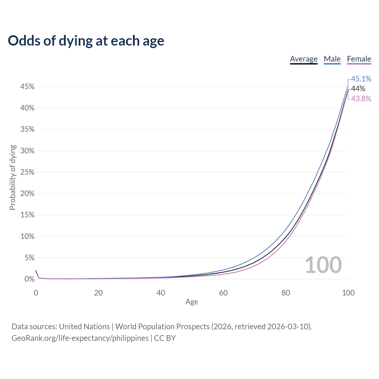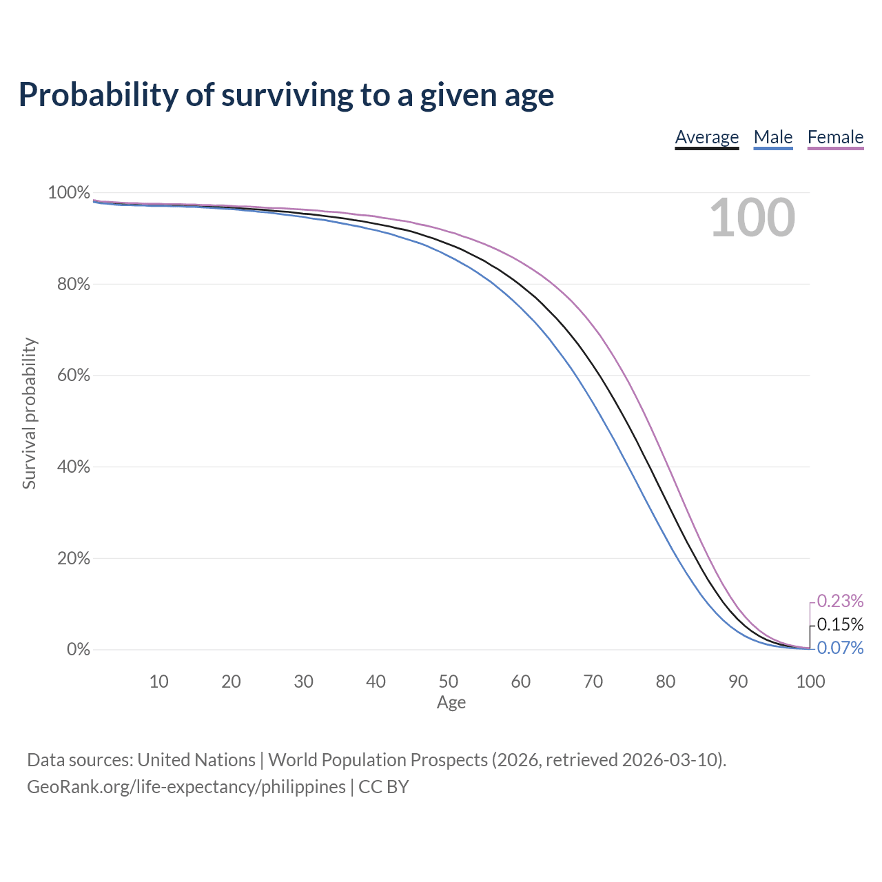 This life expectancy calculator shows the odds of living to 100, 95, 90, and below based on current age for both males and females in the Philippines, along with mean and median age of death. The calculations are based on the 2026 life tables (actuarial tables) from the UN World Population Prospects.