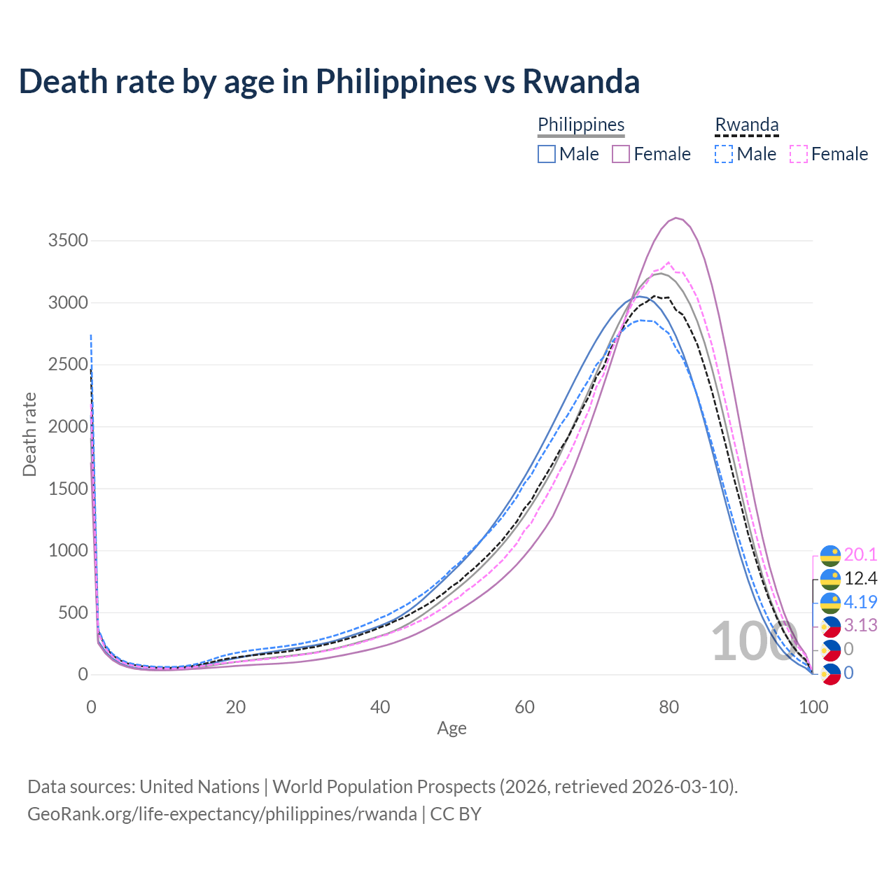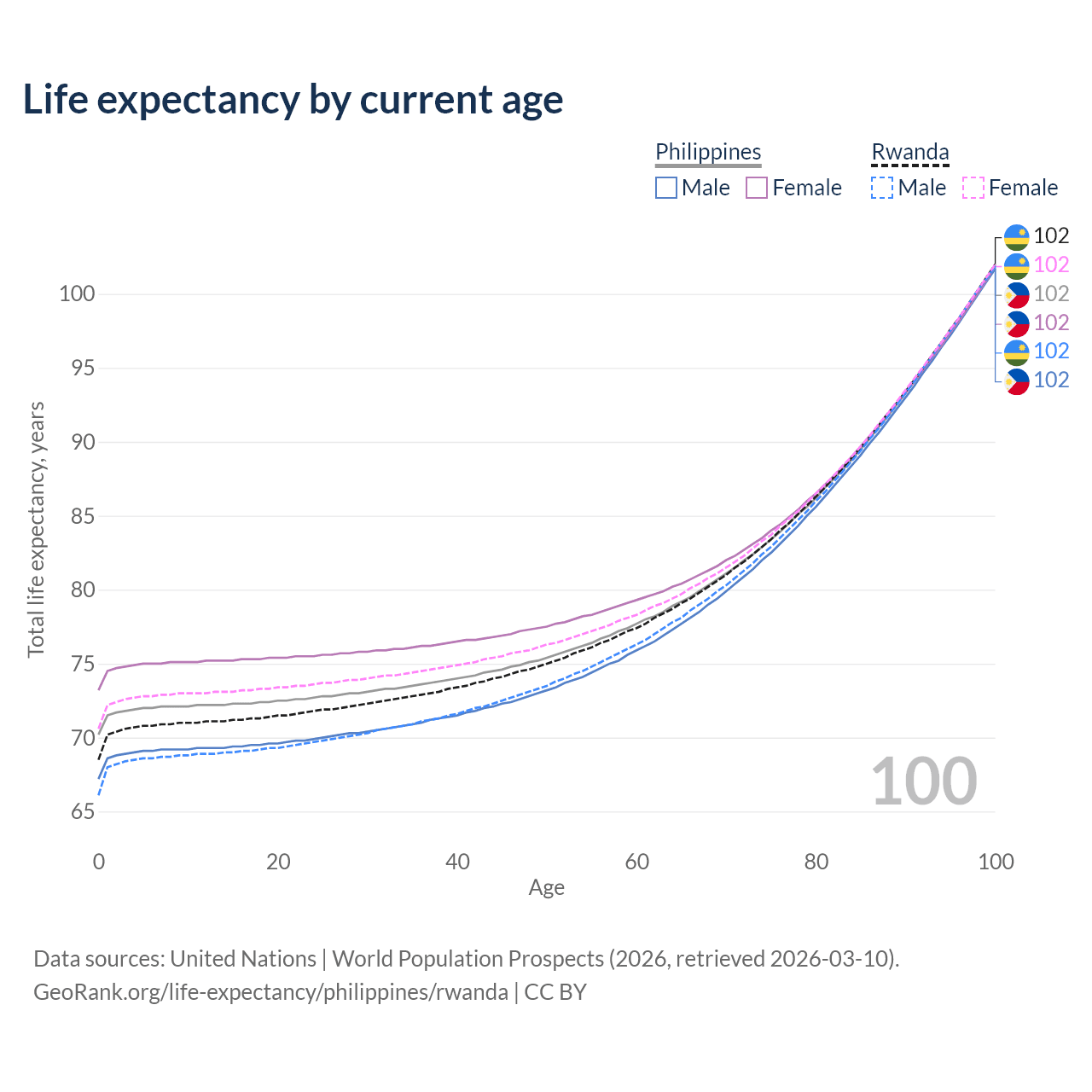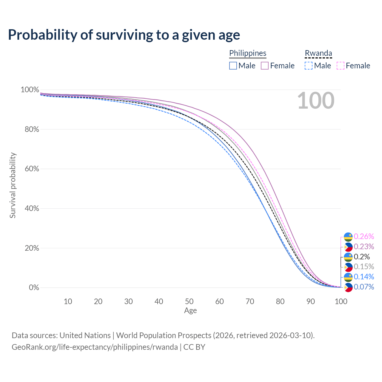 This life expectancy calculator shows the odds of living to 100, 95, 90, and below based on current age for both males and females in the Philippines and Rwanda, along with mean and median age of death. The calculations are based on the 2026 life tables (actuarial tables) from the UN World Population Prospects.