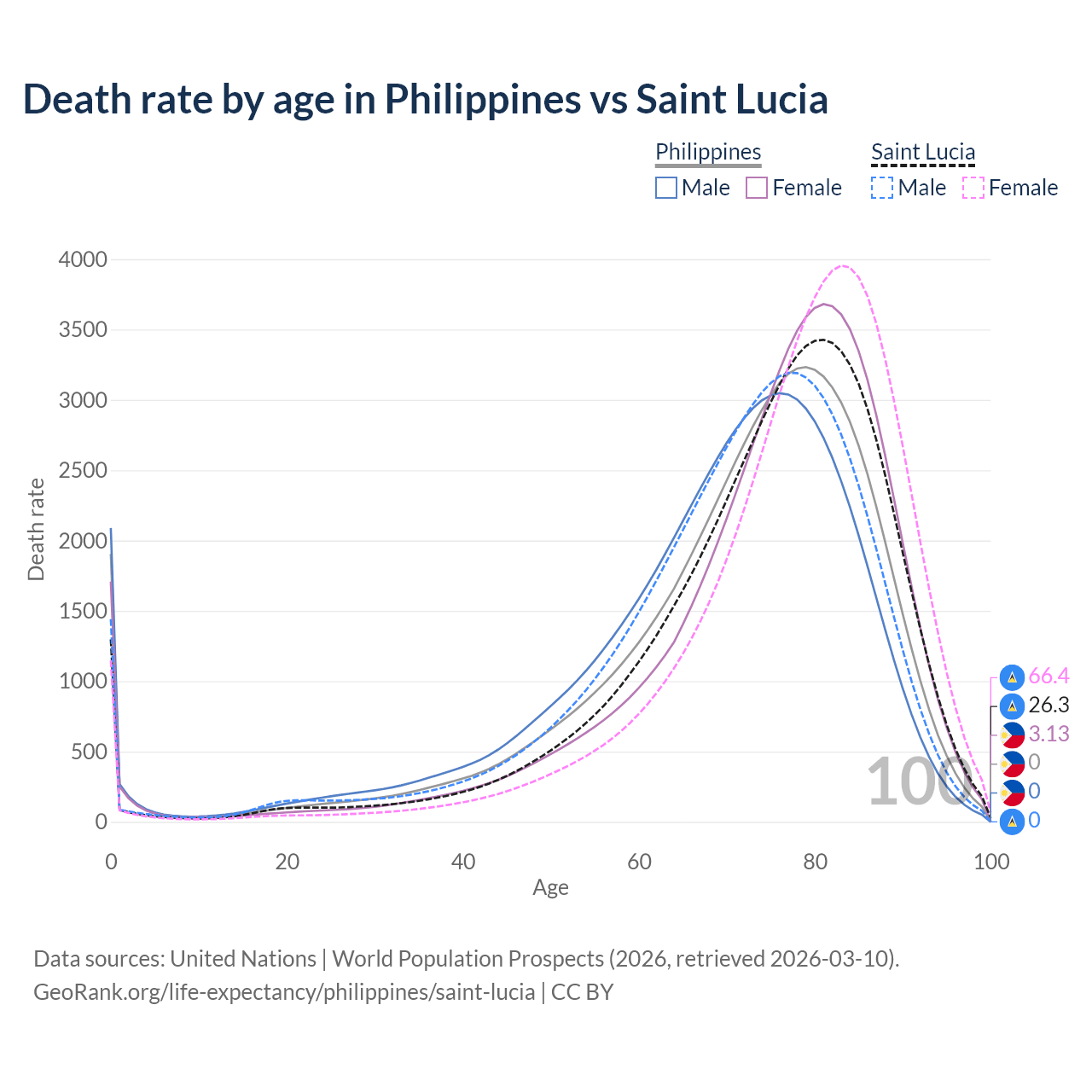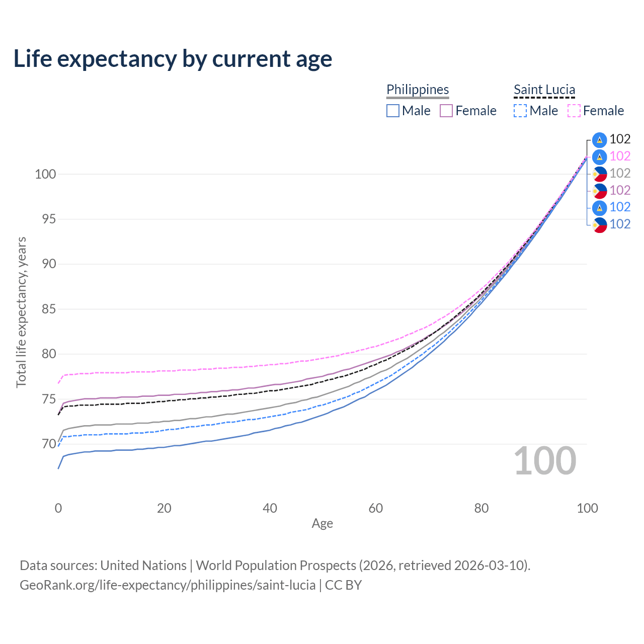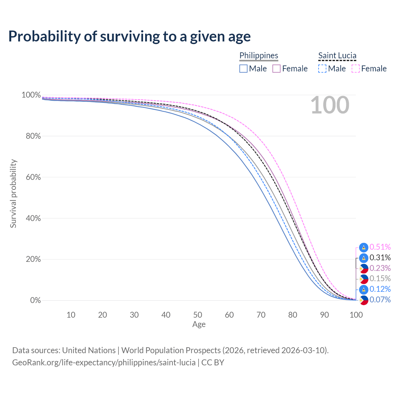 This life expectancy calculator shows the odds of living to 100, 95, 90, and below based on current age for both males and females in the Philippines and Saint Lucia, along with mean and median age of death. The calculations are based on the 2026 life tables (actuarial tables) from the UN World Population Prospects.