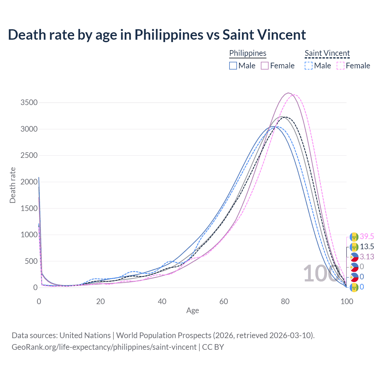 In the Philippines, the most common age of death is 79, compared to 80 in Saint Vincent. The median age of death is 74.6 in the Philippines and 75.6 in Saint Vincent, meaning only half of each cohort is expected to live past that age.
