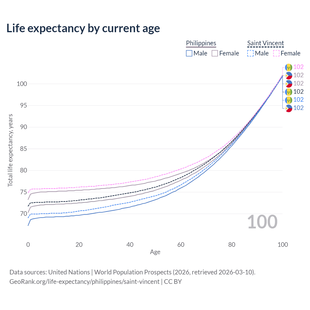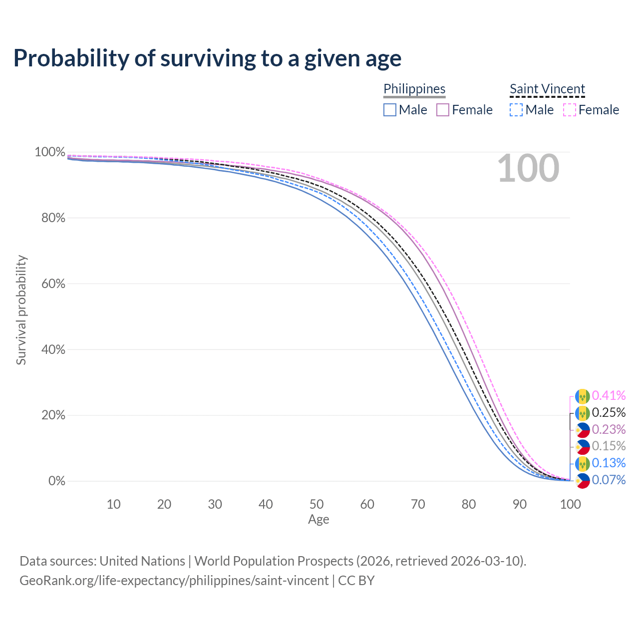 This life expectancy calculator shows the odds of living to 100, 95, 90, and below based on current age for both males and females in the Philippines and Saint Vincent, along with mean and median age of death. The calculations are based on the 2026 life tables (actuarial tables) from the UN World Population Prospects.