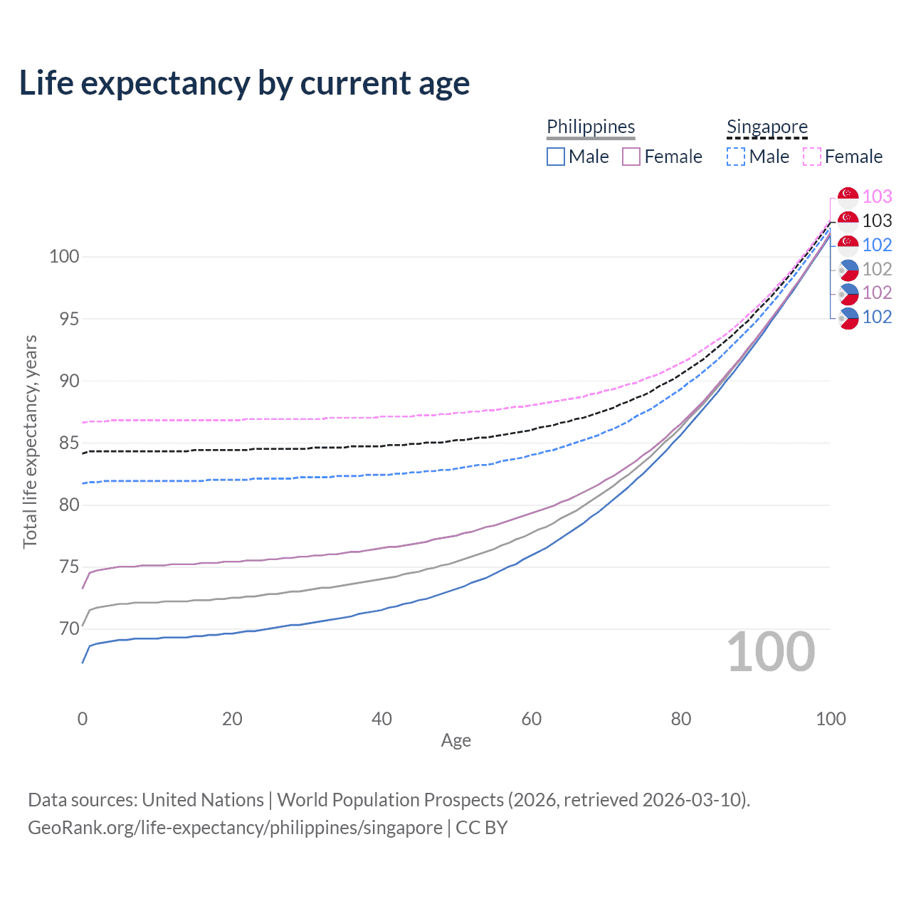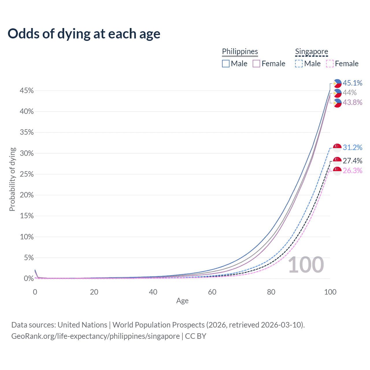 This life expectancy calculator shows the odds of living to 100, 95, 90, and below based on current age for both males and females in the Philippines and Singapore, along with mean and median age of death. The calculations are based on the 2026 life tables (actuarial tables) from the UN World Population Prospects.