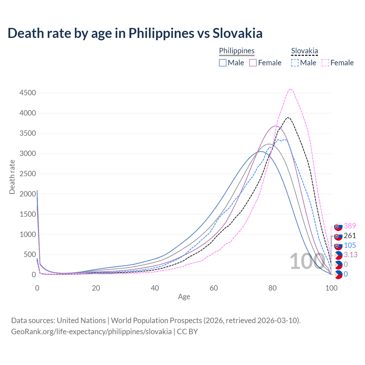 In the Philippines, the most common age of death is 79, compared to 85 in Slovakia. The median age of death is 74.6 in the Philippines and 82 in Slovakia, meaning only half of each cohort is expected to live past that age.