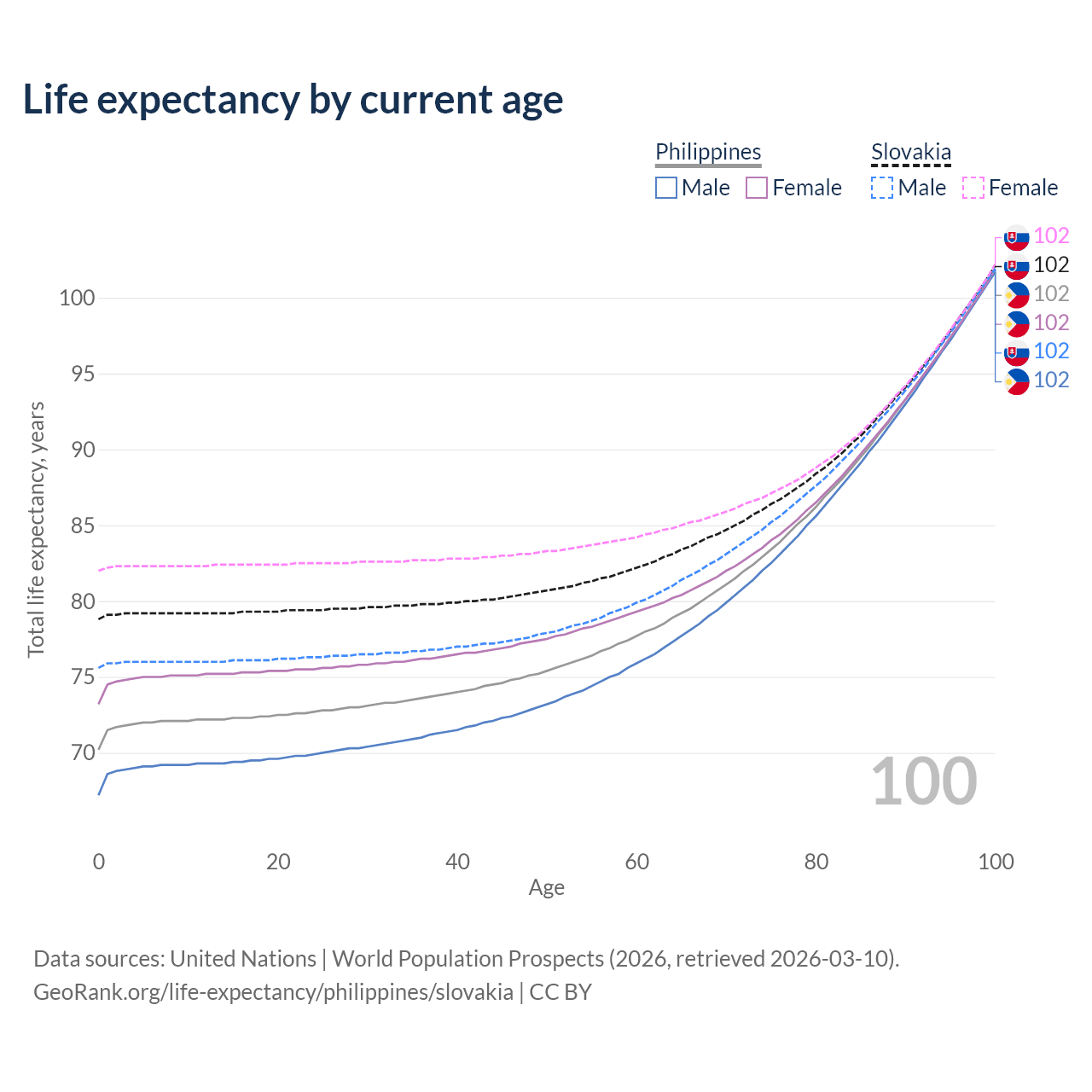 This life expectancy calculator shows the odds of living to 100, 95, 90, and below based on current age for both males and females in the Philippines and Slovakia, along with mean and median age of death. The calculations are based on the 2026 life tables (actuarial tables) from the UN World Population Prospects.
