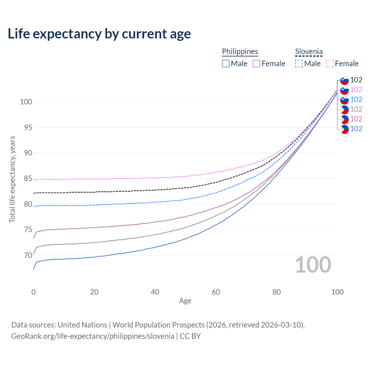 This life expectancy calculator shows the odds of living to 100, 95, 90, and below based on current age for both males and females in the Philippines and Slovenia, along with mean and median age of death. The calculations are based on the 2026 life tables (actuarial tables) from the UN World Population Prospects.