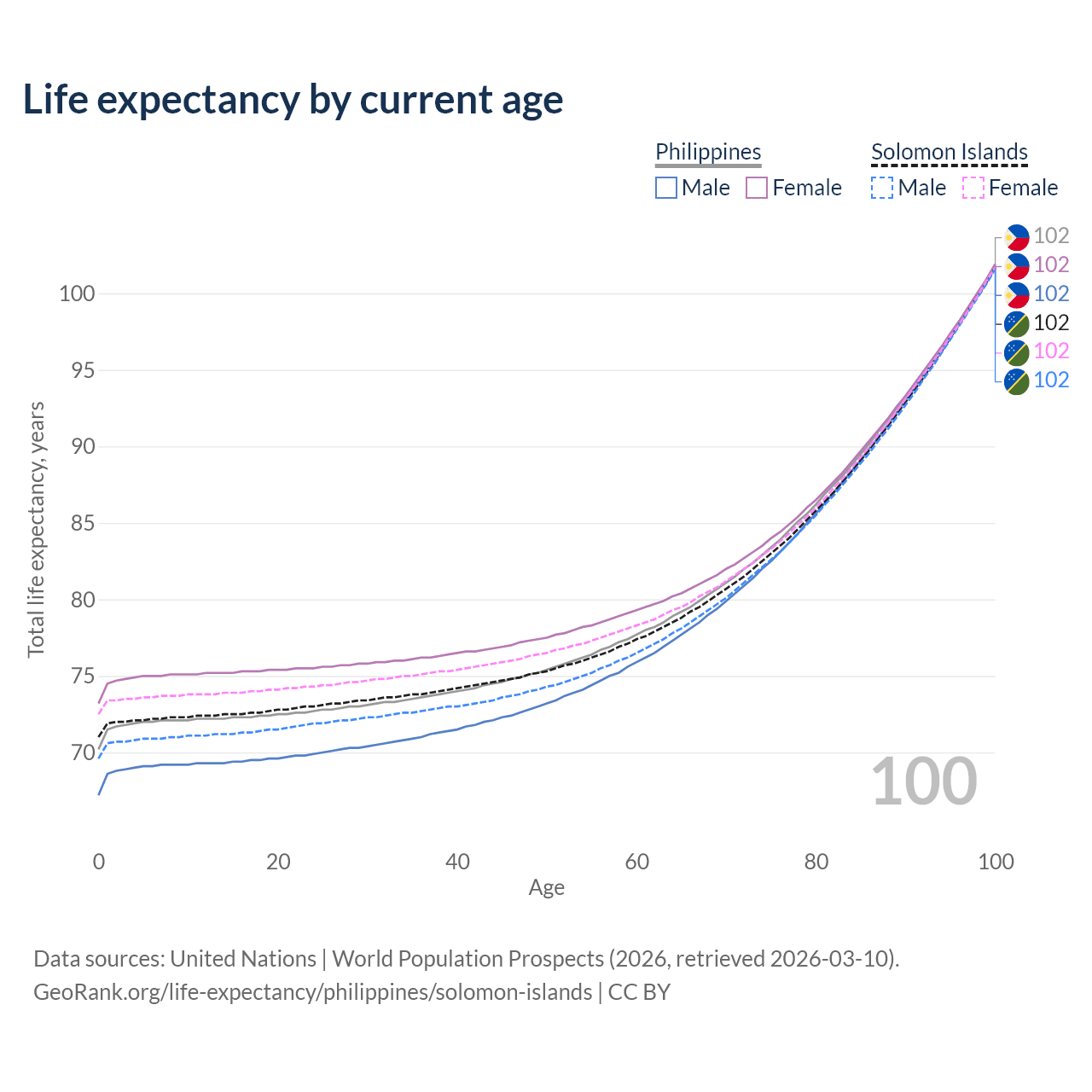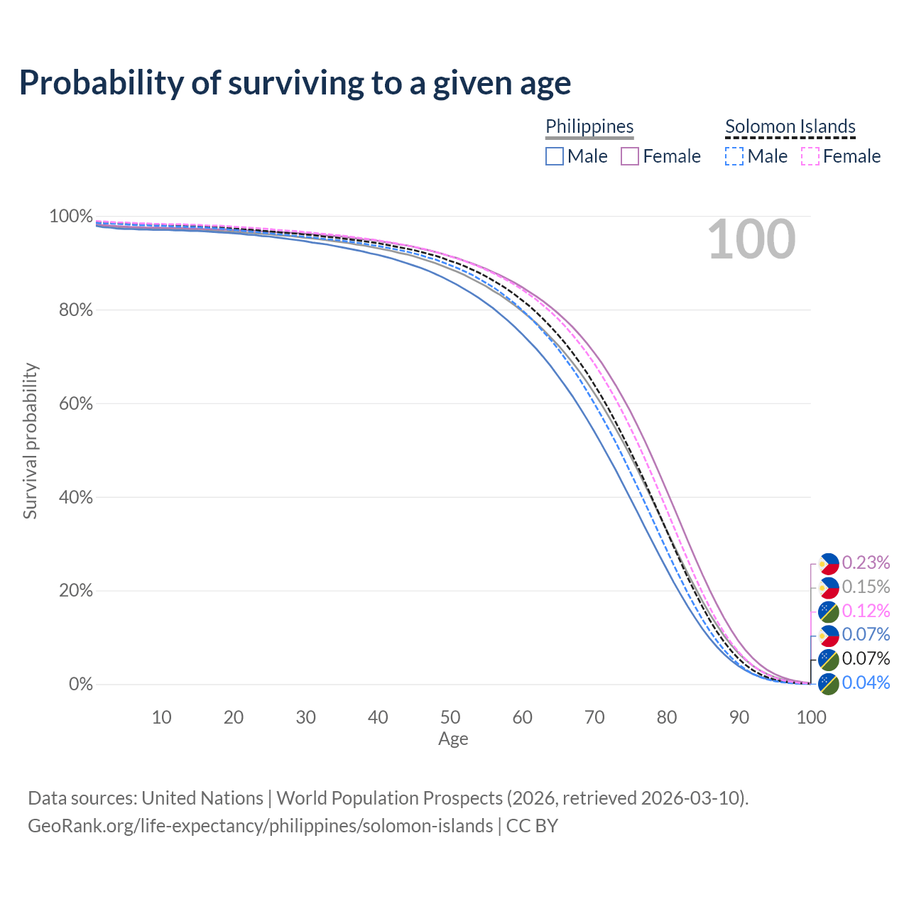 This life expectancy calculator shows the odds of living to 100, 95, 90, and below based on current age for both males and females in the Philippines and the Solomon Islands, along with mean and median age of death. The calculations are based on the 2026 life tables (actuarial tables) from the UN World Population Prospects.